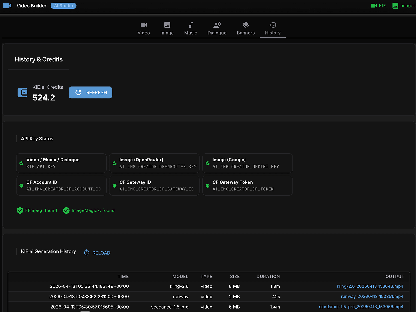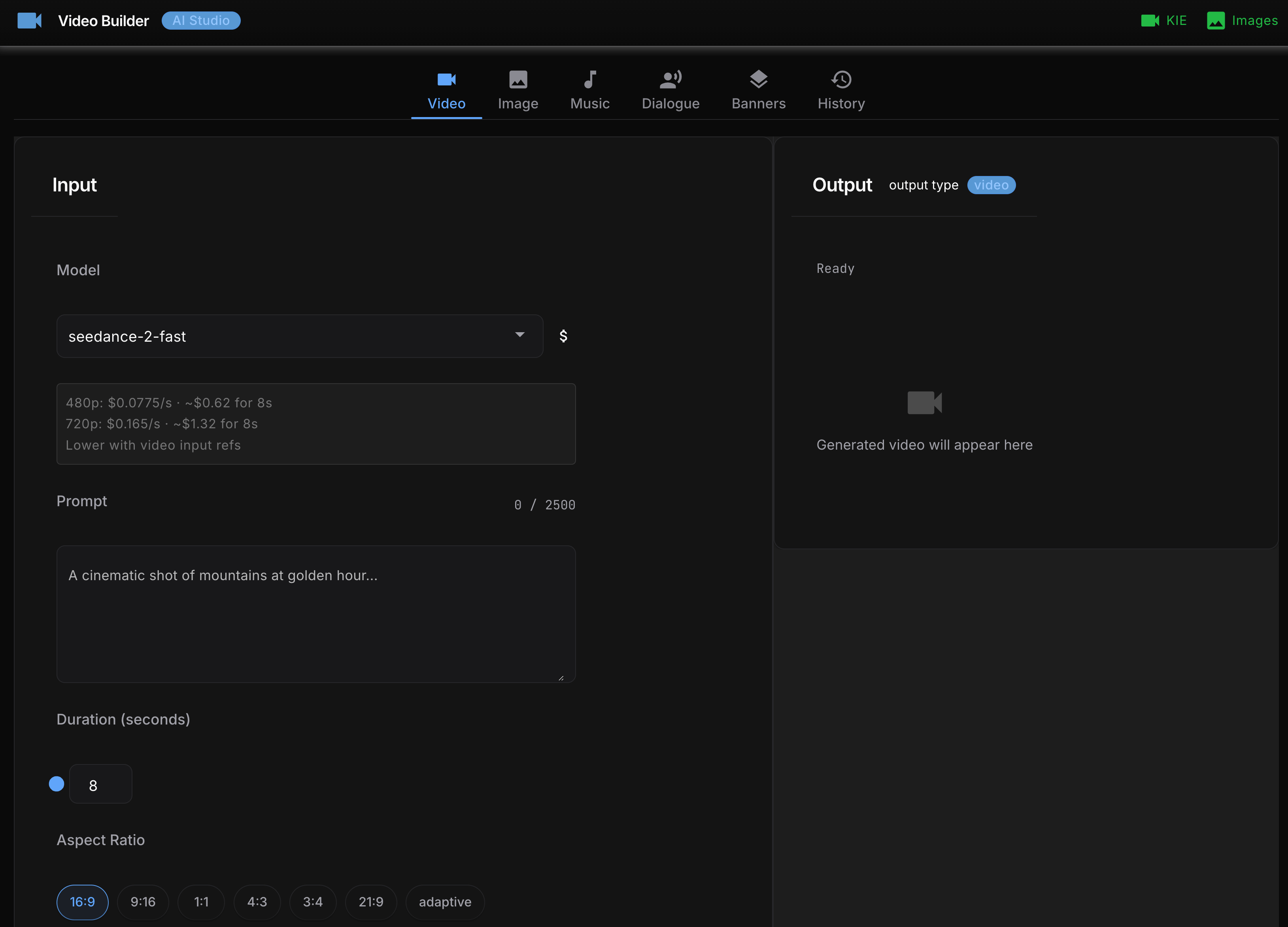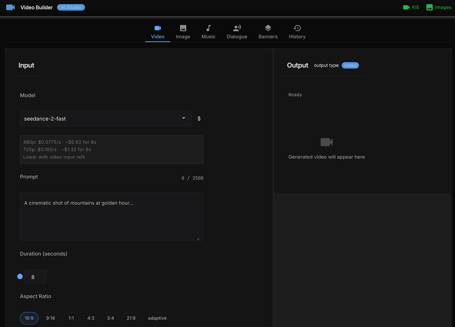 It’s called ai-video-creator, and it’s built on top of KIE.ai - a unified API that aggregates ByteDance Seedance, Kling, Google Veo, Grok Imagine, Wan, Runway, ElevenLabs, and Suno AI behind a single authentication flow. From research, KIE.ai seems to be the cheapest PAYG option that doesn’t require a monthly subscription plan or paying for yearly plans to get a discount.