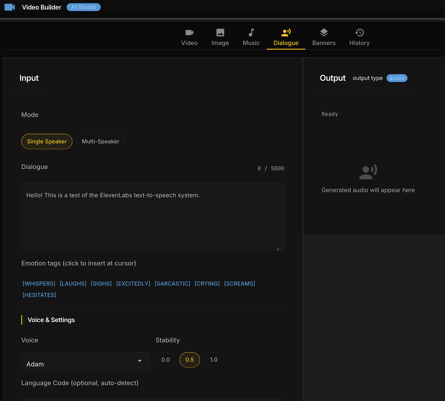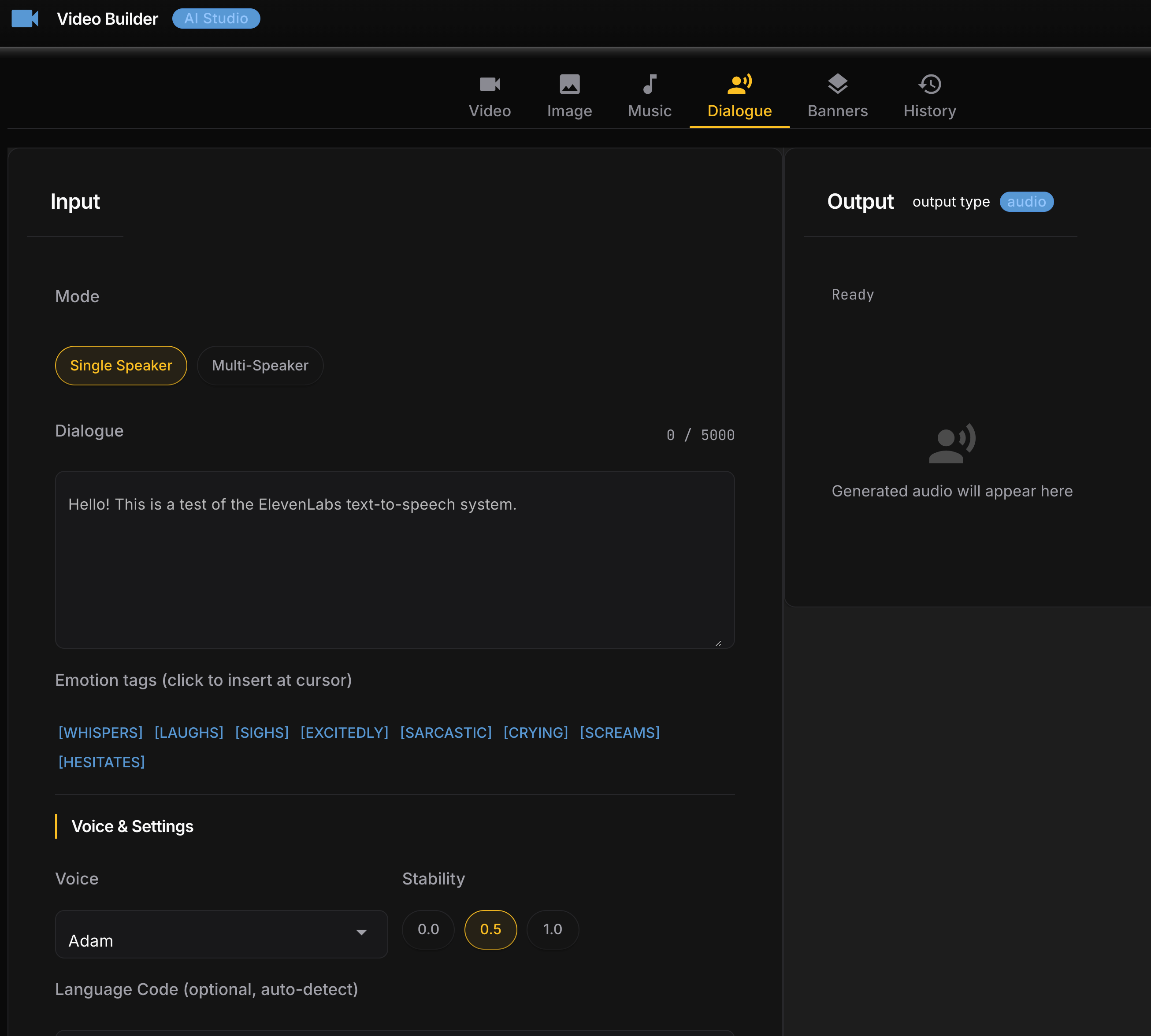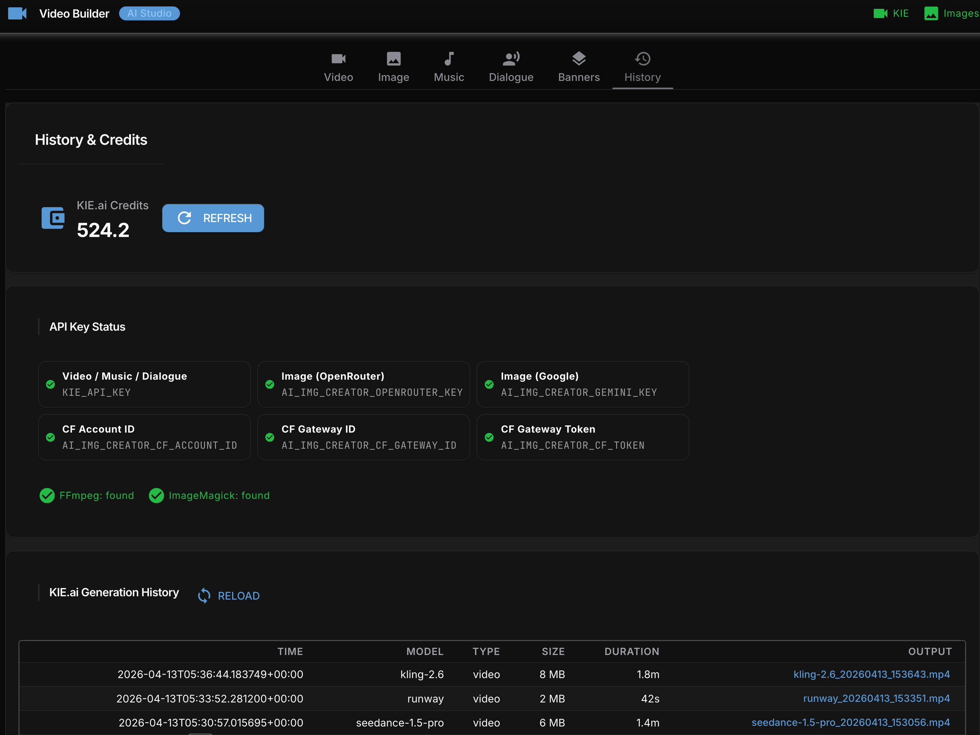 After the CLI was working I built a local web GUI using NiceGUI – a Python library that spins up a local web server with no frontend build step. Six tabs: Video, Dialogue, Music, History, Credits, Setup.