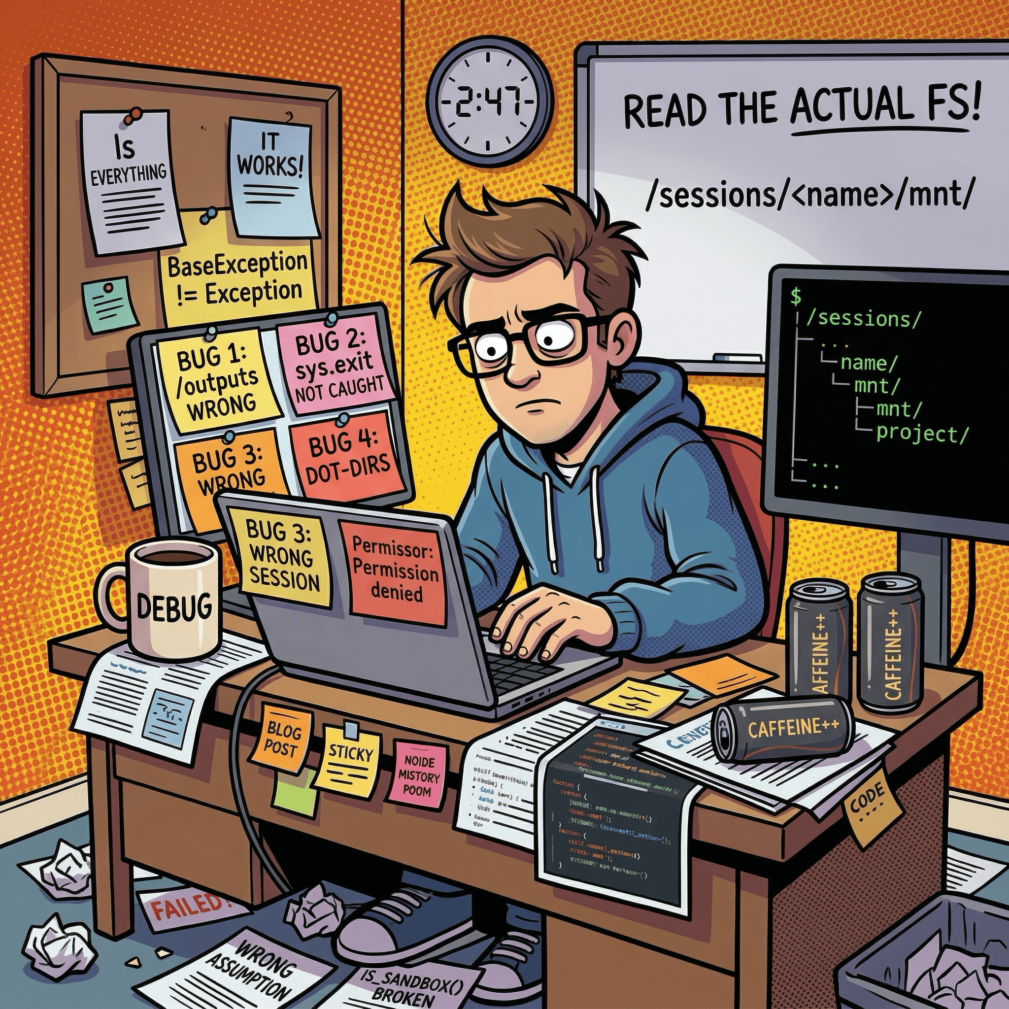 Actually read the filesystem. Four sandbox path bugs all came down to assumptions about where things should be, rather than checking where things actually are. When debugging any environment-specific issue, ls first.