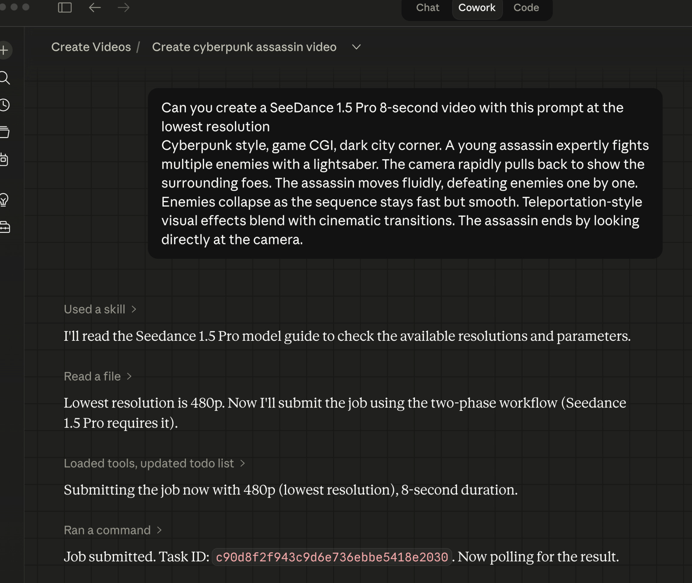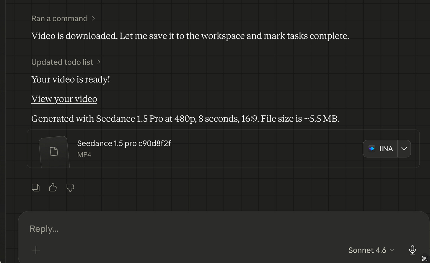 Claude Cowork example video generation using ByteDance Seedance 1.5 Pro: