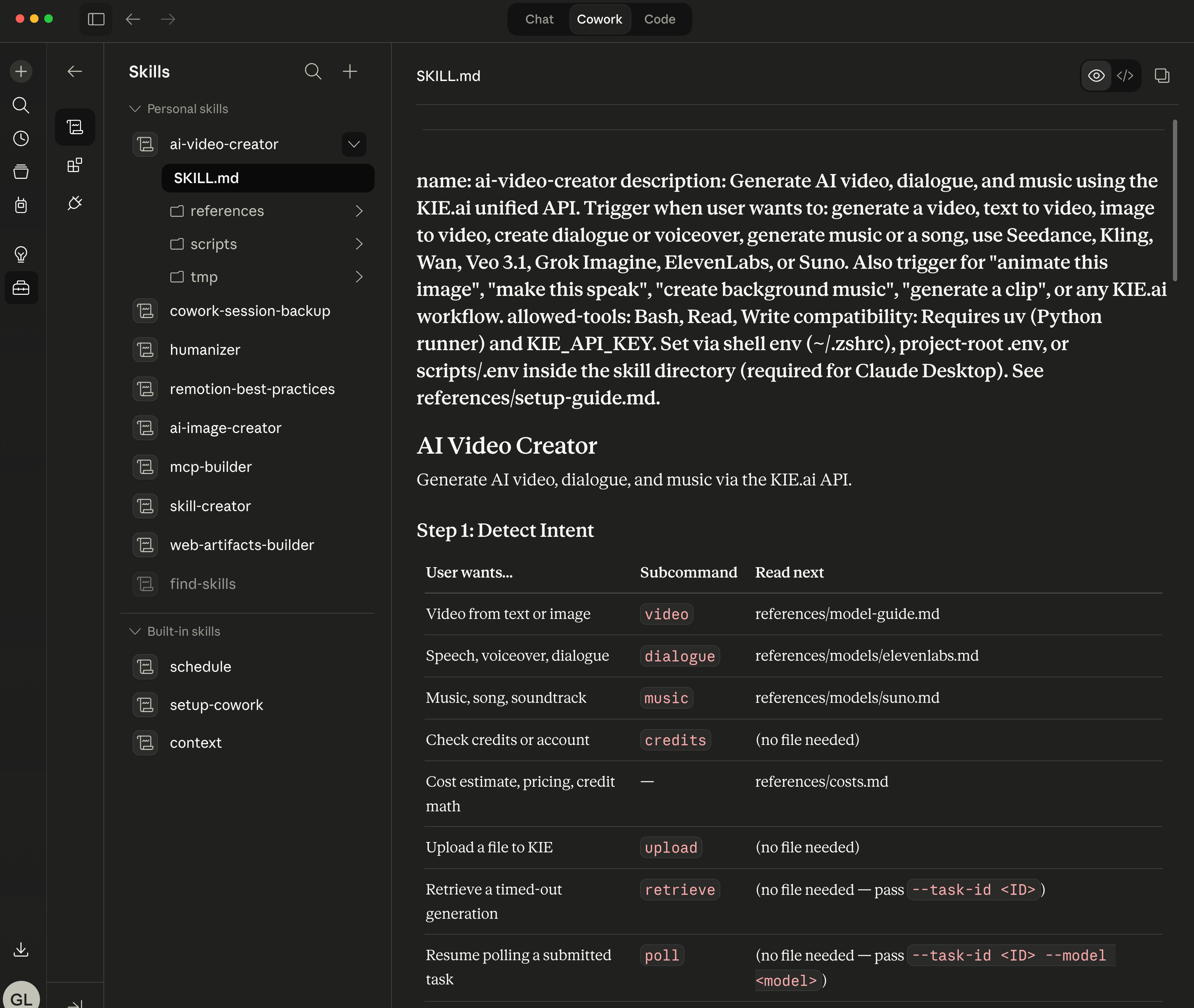 So I built ai-video-creator as a companion skill: same pattern, same philosophy, now covering 11 AI video models from your terminal or Claude Cowork desktop with a single API key.