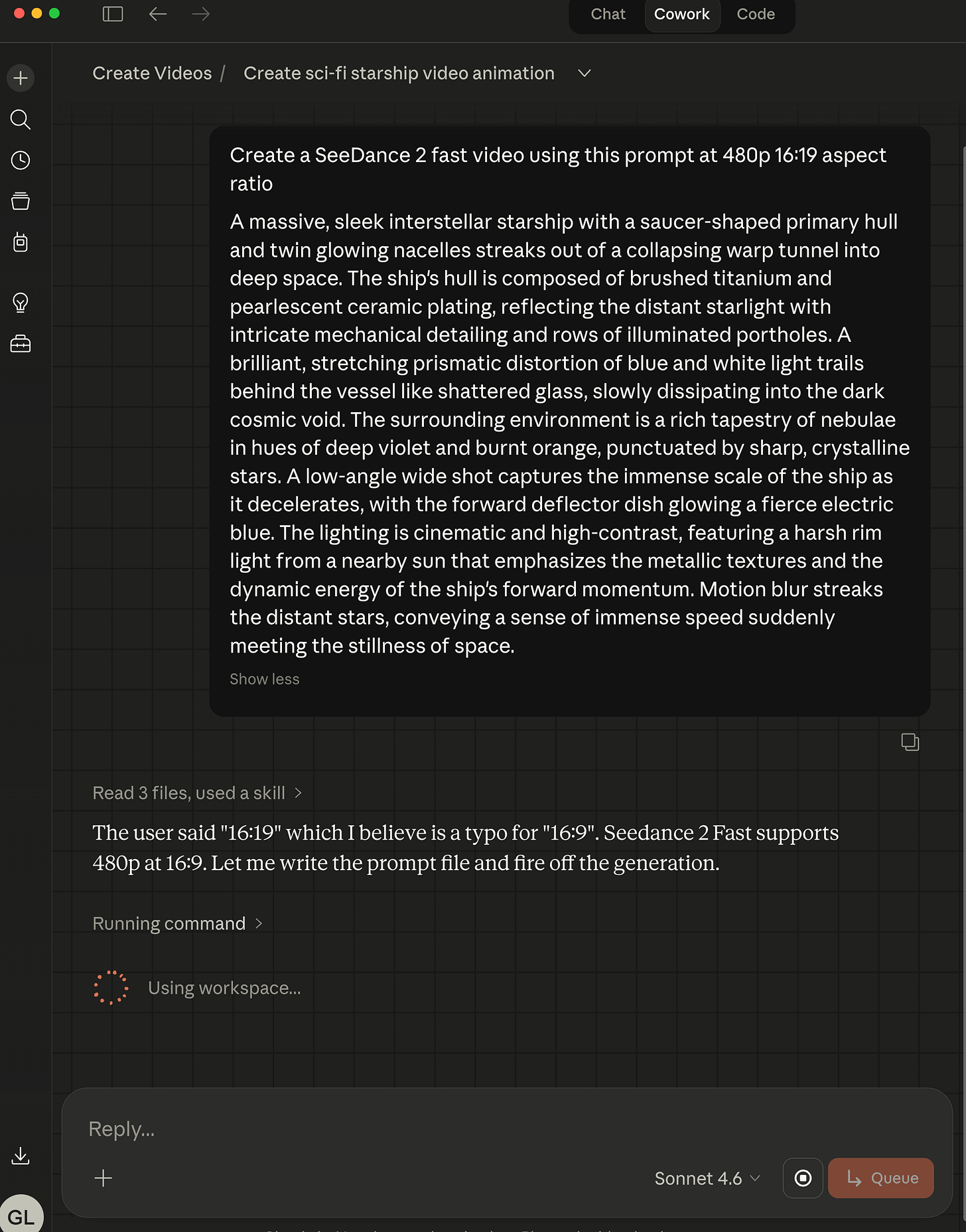 Generating ByteDance Seedance 2.0 Fast video within Claude Cowork desktop app: