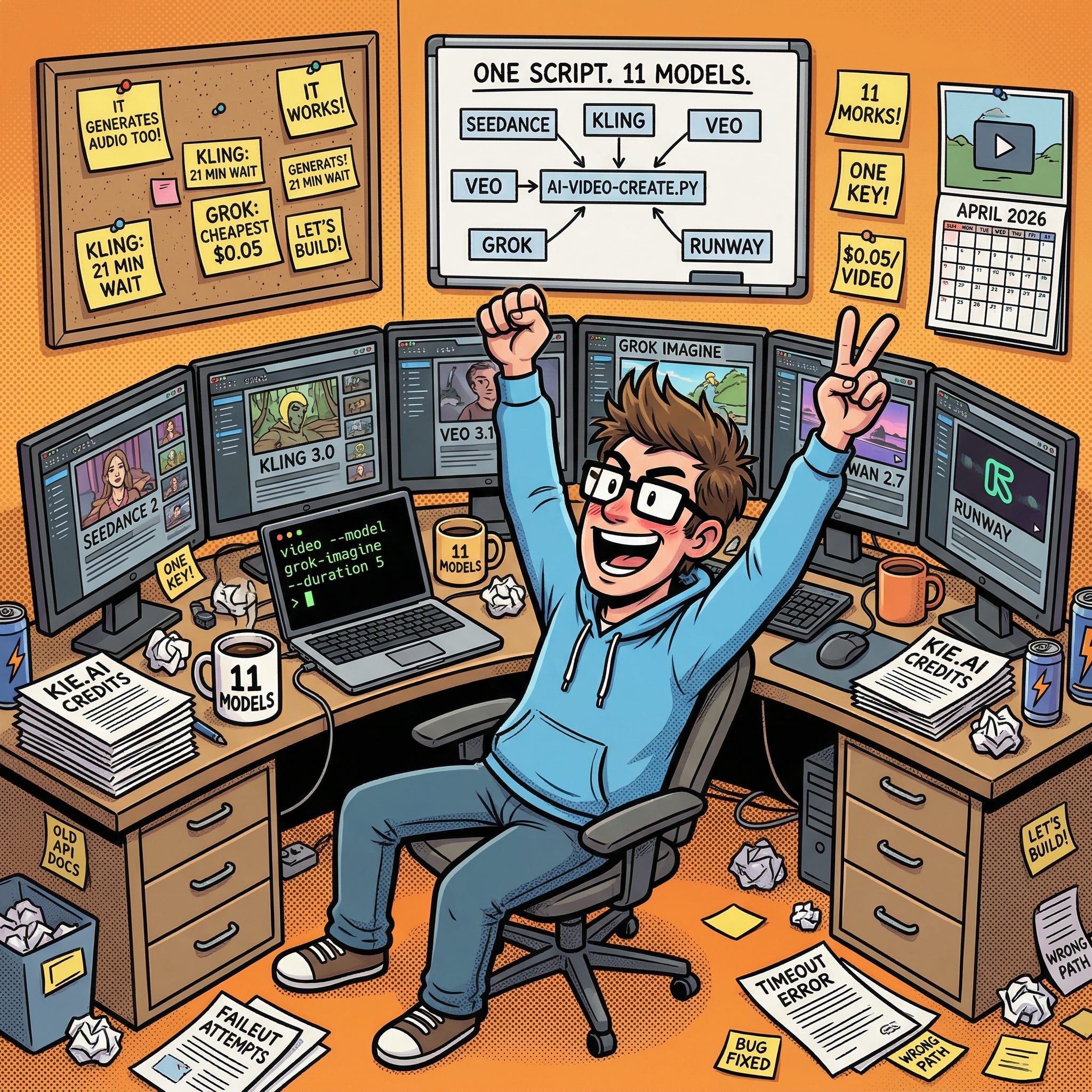 One API key, one command, eleven models – Seedance, Kling, Veo, Grok Imagine, Runway, and more, all from your terminal or desktop.
