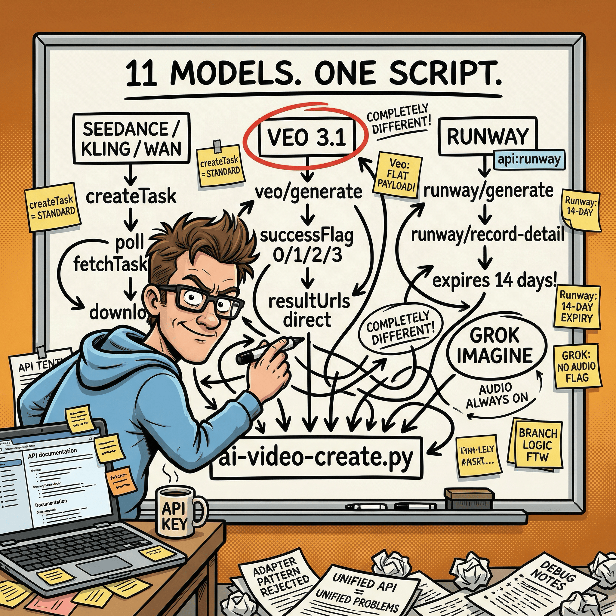 I went with explicit branches. Each divergent API gets an "api": "veo" or "api": "runway" flag in the model registry, and the dispatcher routes accordingly. The code is longer but every failure is easy to trace to its actual cause. A leaky abstraction that hides API differences saves you code until the moment it doesn’t, at which point debugging becomes much harder.