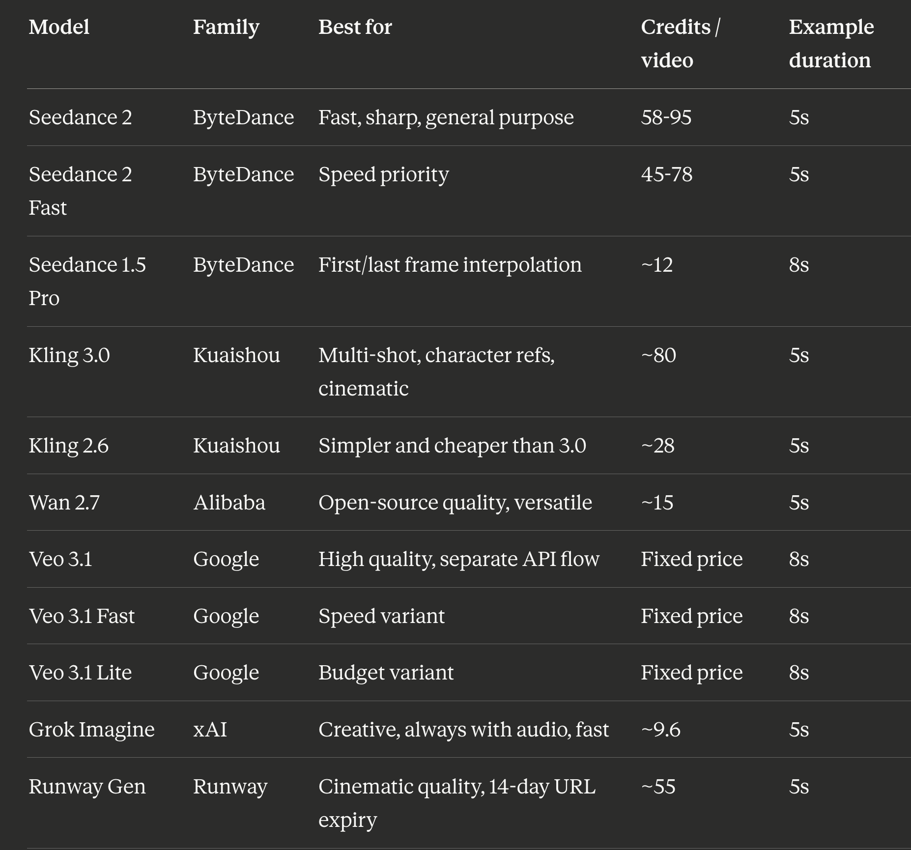 Credit costs are approximate via KIE.ai as of April 2026. Seedance 2 and Seedance 2 Fast ranges are for 480P at 5s: lower end is image-to-video (reference frame provided), upper end is text-to-video (no reference). 720P roughly doubles the credit cost at both tiers. At $0.005 per credit, a Seedance 2 Fast text-to-video 480P clip runs about $0.39 - confirmed from a real 8s run at 124 credits (15.5 cr/s). The cheapest model I actually tested was Grok Imagine at about $0.05 per clip. Kling 3.0 is the priciest at $0.40+ per clip but the output quality is noticeably more cinematic.