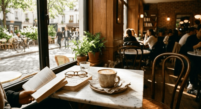 Subject: A first-person POV inside a cozy Parisian cafe — steaming latte with latte art on a marble table, two books (including “The Hidden Life of Trees” with tortoise-shell glasses resting on top), a hand holding an open book, and a large window overlooking a bustling street with trees and passersby.