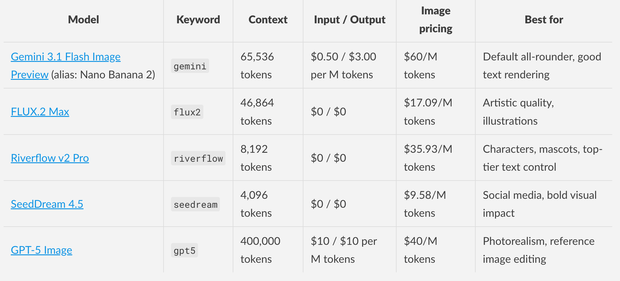 I am working on expanding model support as new image generation models land on OpenRouter. I am also exploring batch generation workflows where the skill generates all visual assets for a web project (favicon, OG image, social banners, app icons) from a single brand brief.