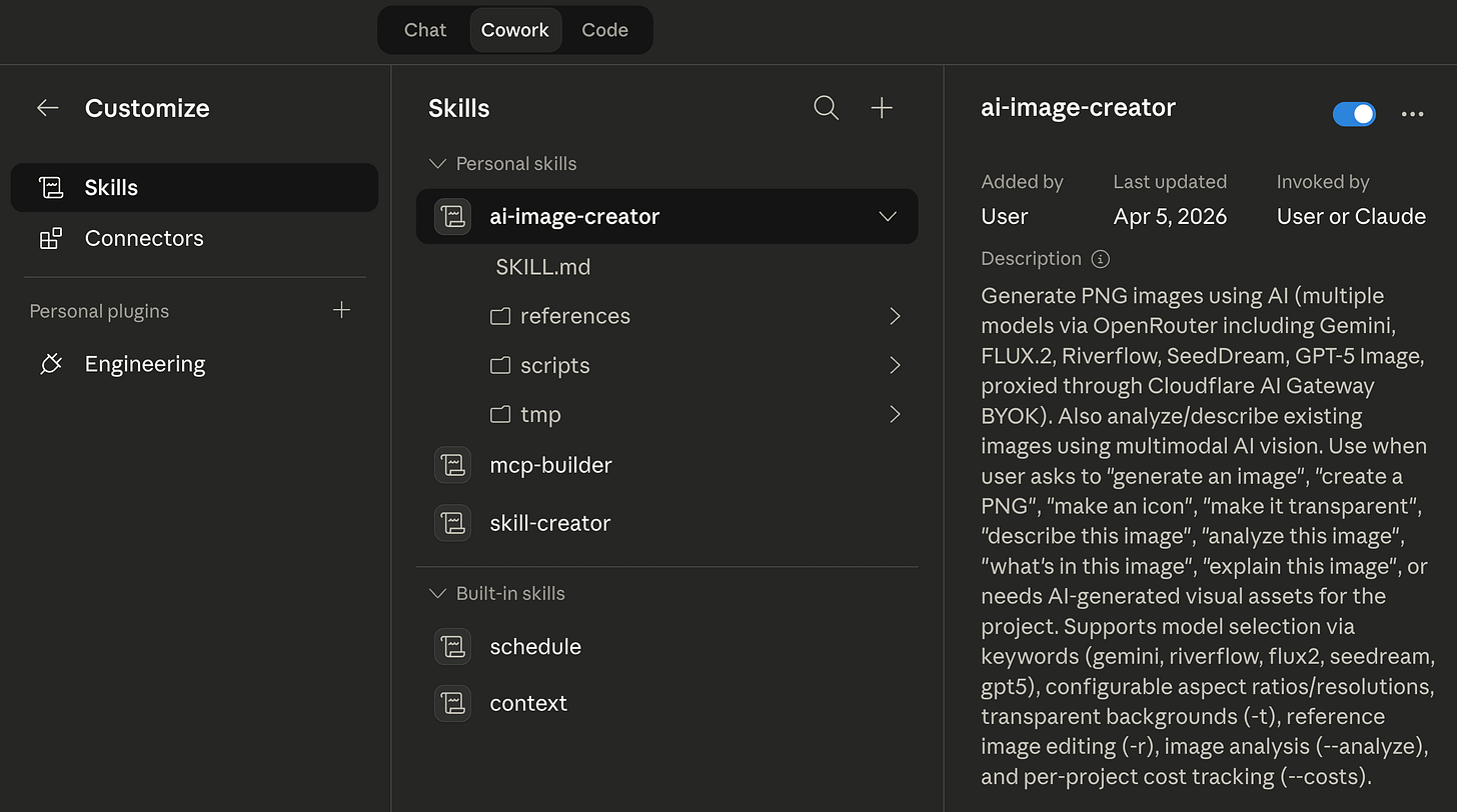 AI_IMG_CREATOR_CF_TOKEN=your-gateway-tokenThen zip the entire ai-image-creator/ folder (with the populated .env inside) and install it as a skill in Cowork. The script loads the .env automatically on startup. Shell exports take precedence over the .env if both are present.