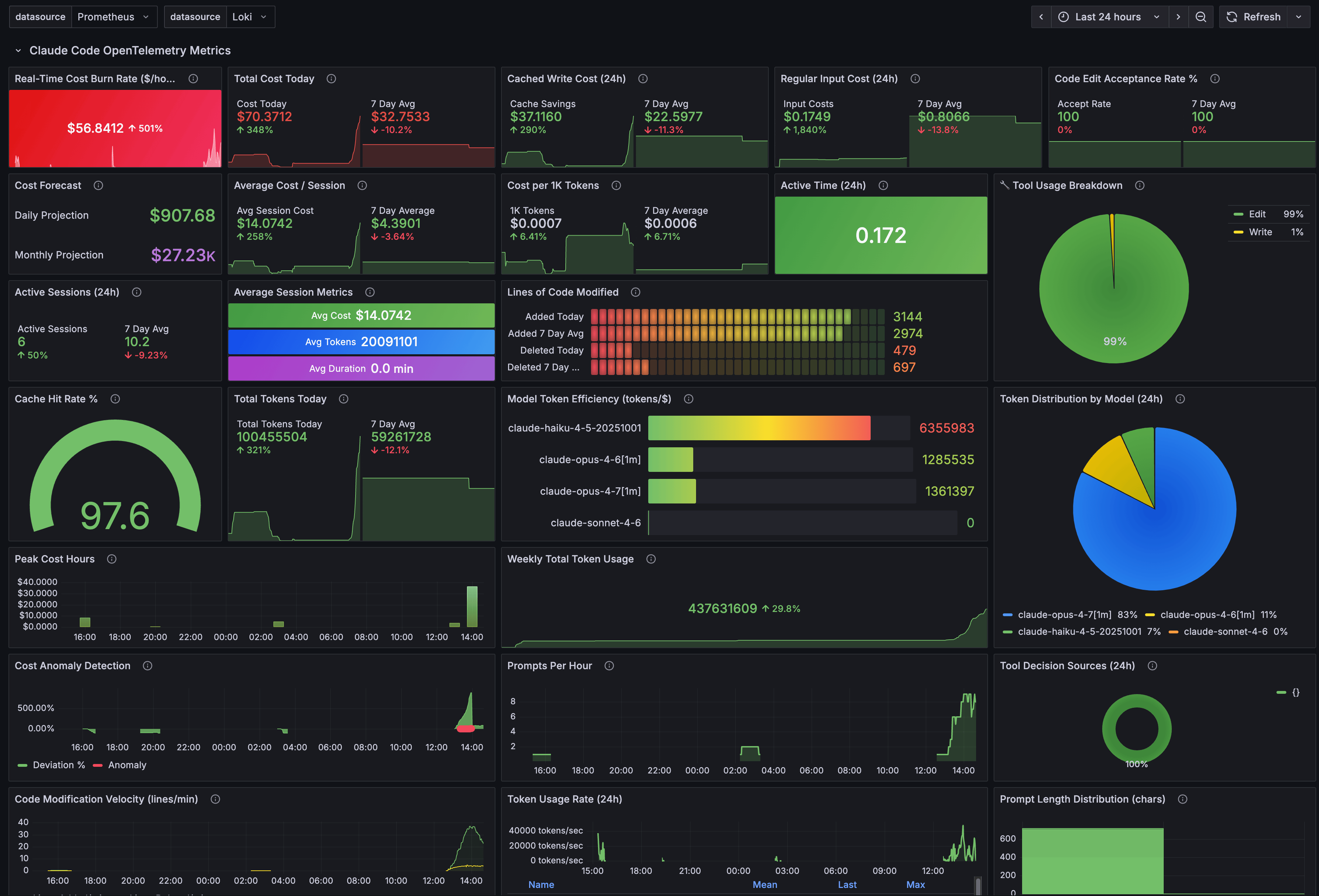 And the Claude Code OpenTelemetry Grafana usage dashboard showing the session clearly. Seems Claude Opus 4.7 1 million token window is slight more efficient than Opus 4.6 1 million token window for tokens per $1.