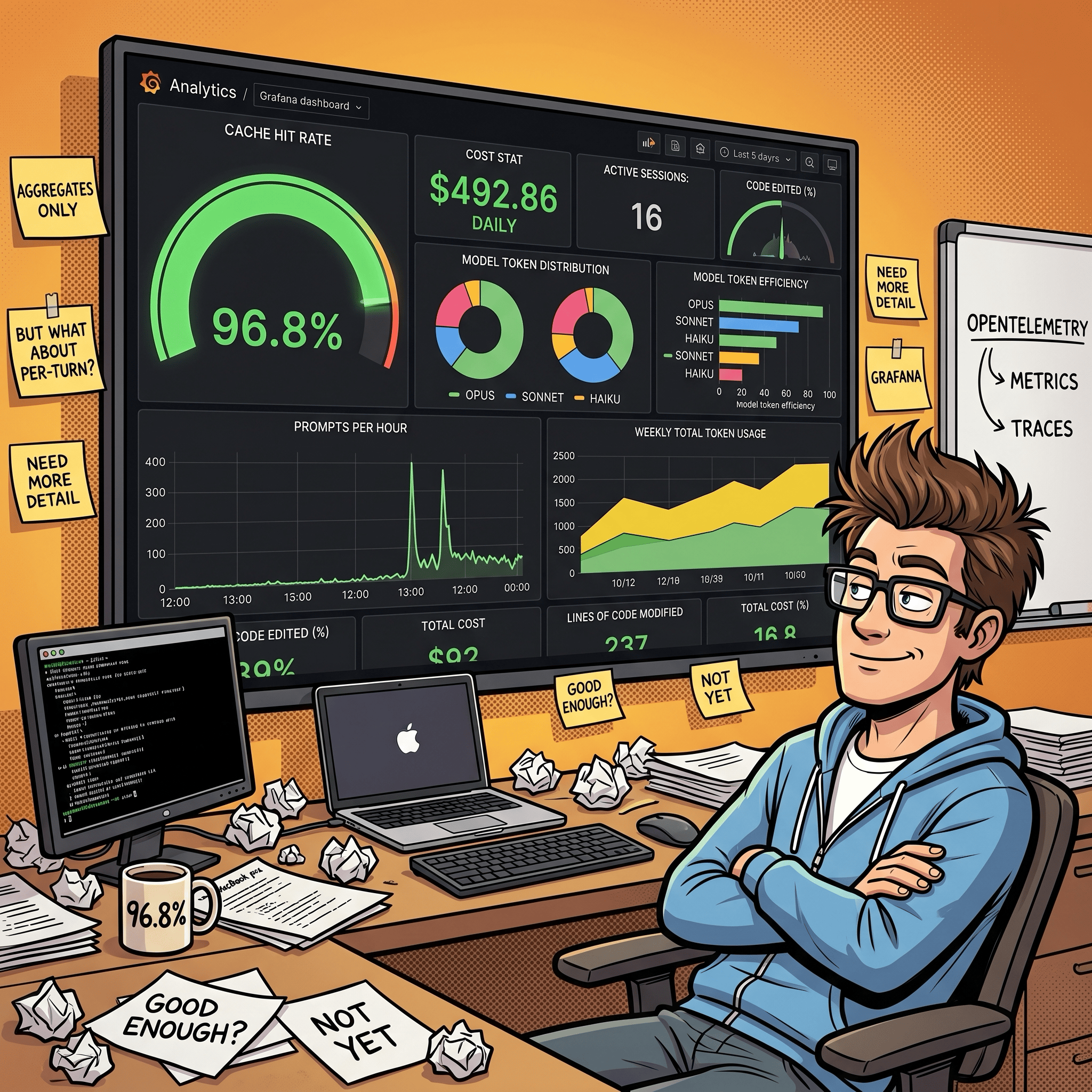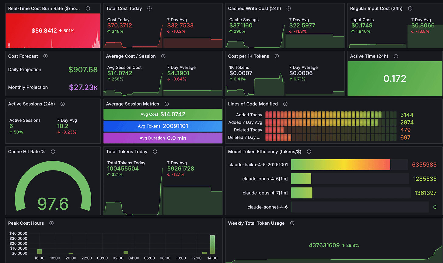 I’ve been building with Claude Code daily for weeks. Videos, MCP servers, skills, GUI tools. I already track costs through Claude’s OpenTelemetry integration piped into Grafana. The aggregate picture looked good: 97.8% cache hit ratio, $2,171 in estimated savings across 44 sessions.