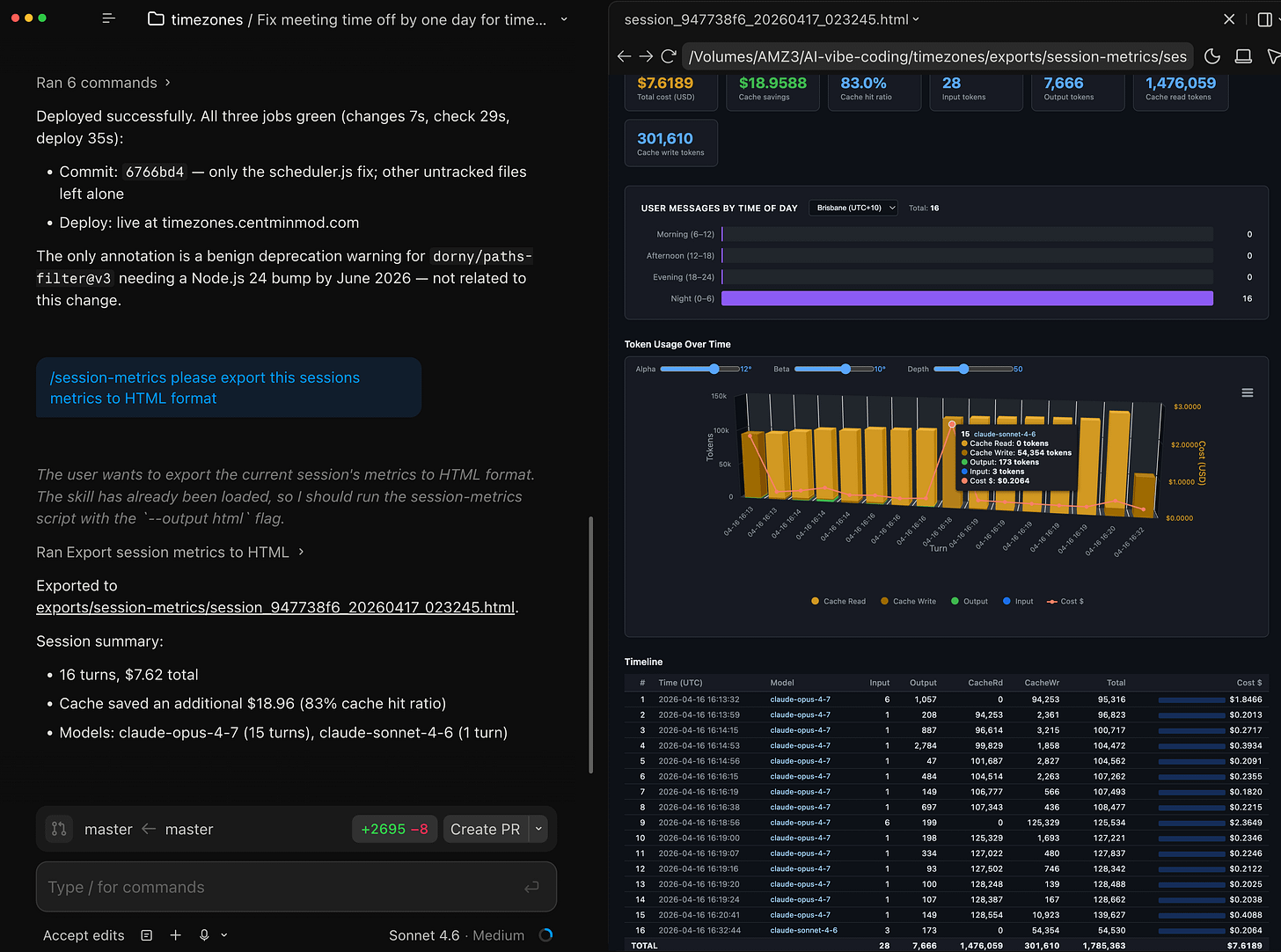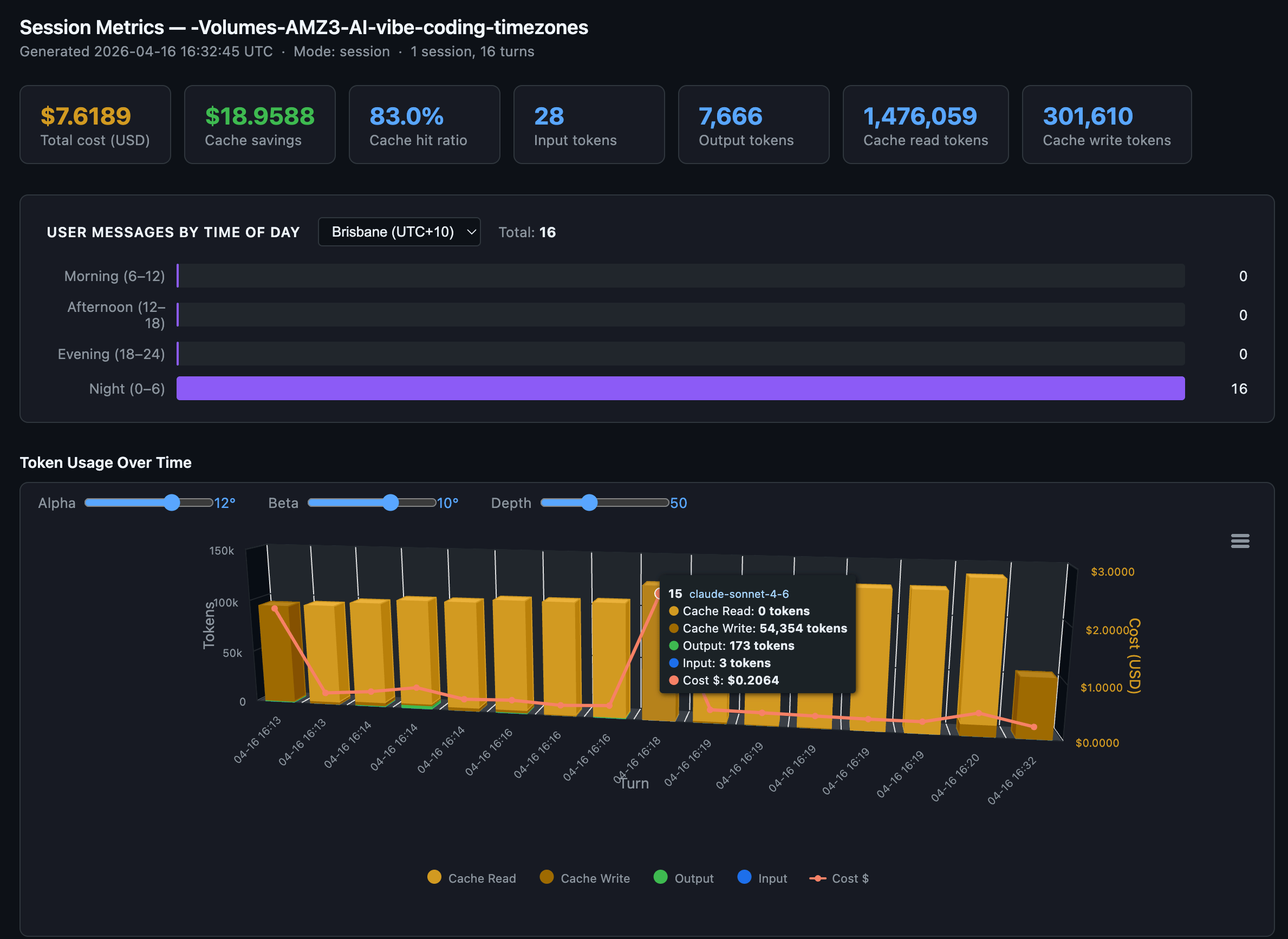 I told Claude to build a script that reads these logs and produces a per-turn cost table. Seventy-three minutes later, I had a working tool: 971 lines of Python, five export formats (text, JSON, CSV, Markdown, HTML), and an interactive dark-themed HTML report with 3D stacked column charts.