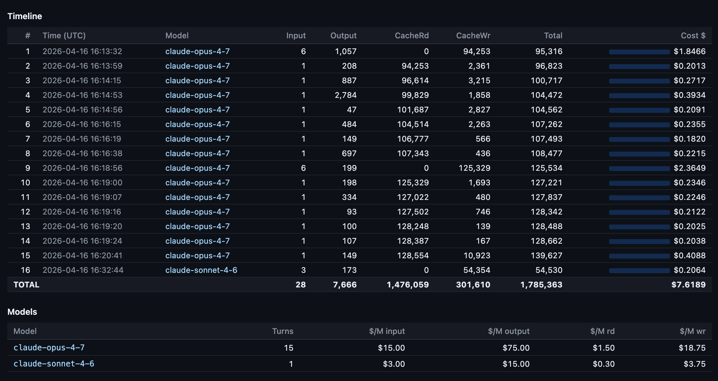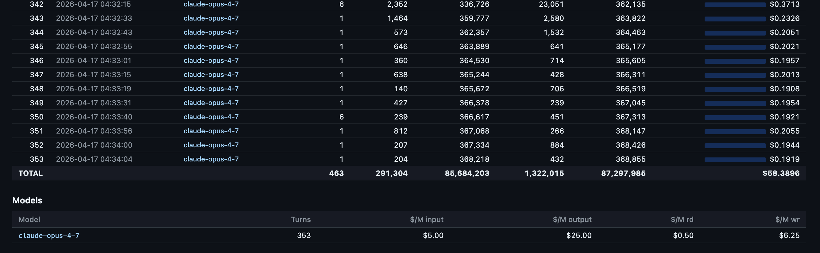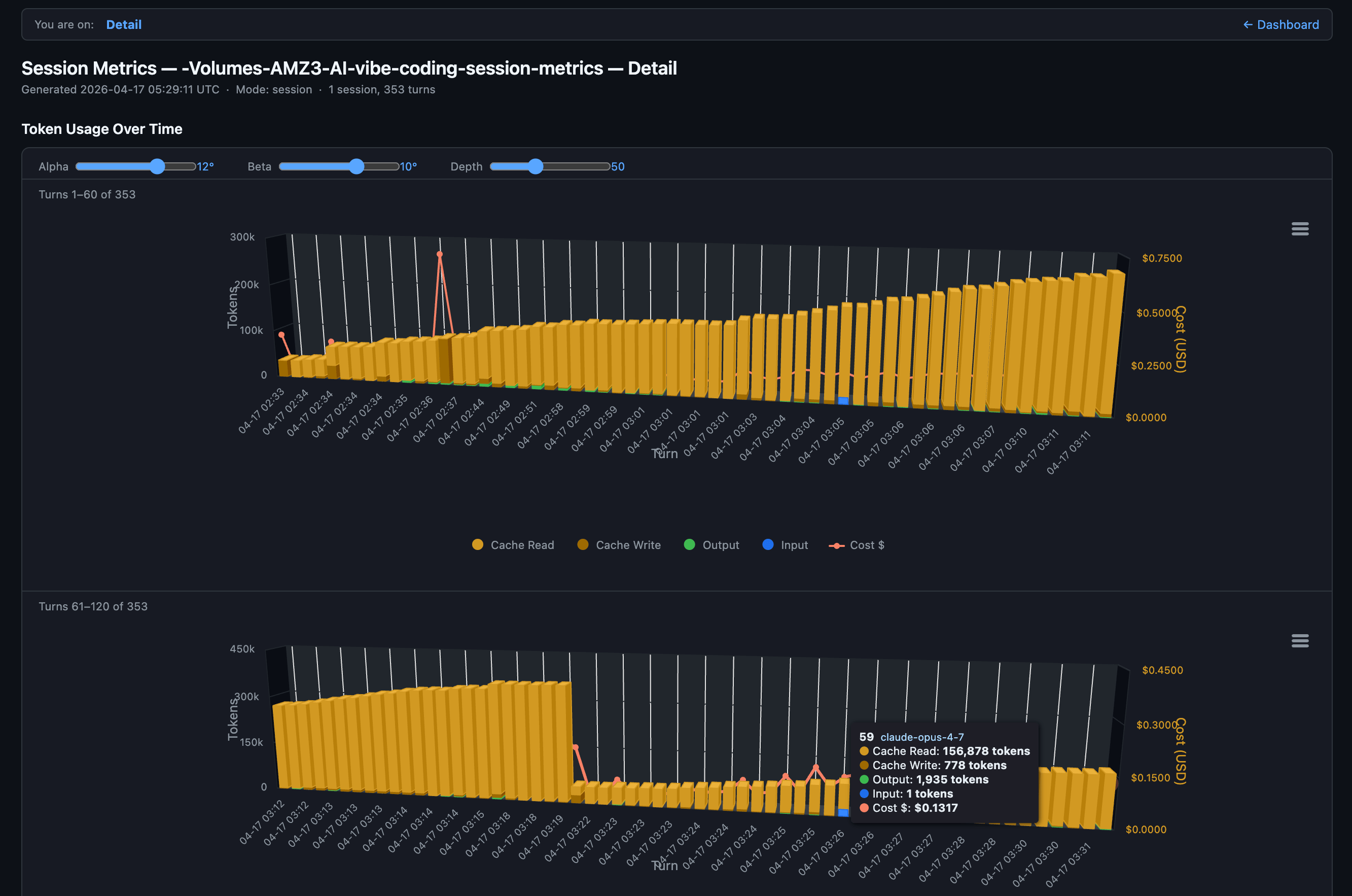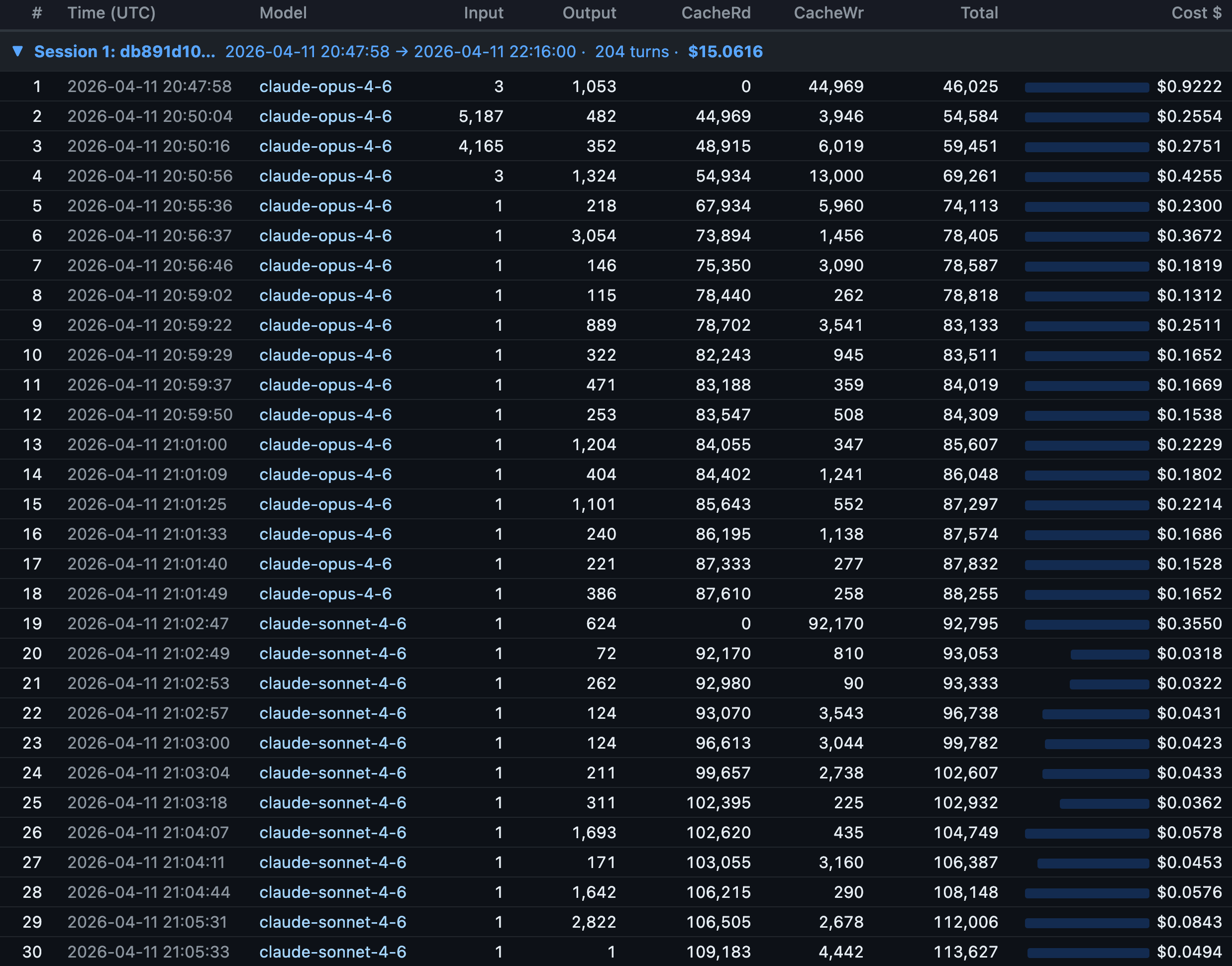 The first insight came immediately. Turn 1 of a session costs the most (cache write for the entire context), and every subsequent turn rides the cache for a fraction of the price. Some responses cost $0.03 (a quick Sonnet answer). Others cost $0.92 (a dense Opus planning turn). The numbers were right there, per row, with timestamps.