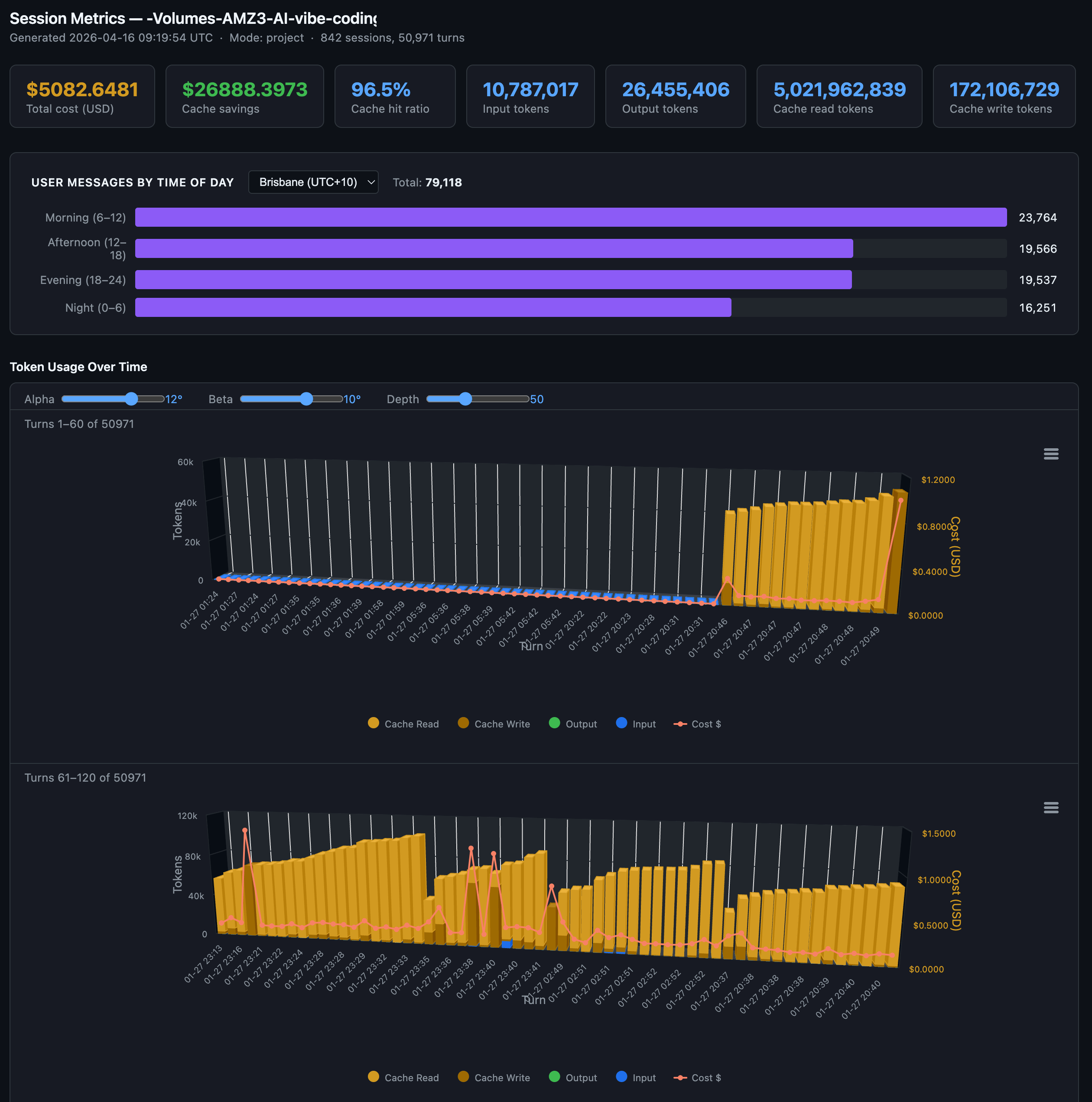 Another larger Claude Code project with 96.5% cache hit ratio with 10.7 million input tokens, 26.45 million output tokens, 5 billion cache read tokens and 172 million cache write tokens over 50,971 turns over 842 sessions. This project was mainly before I shifted my Claude Code sessions to off-peak times, so they are shown to be more uniformly spread out throughout the day.