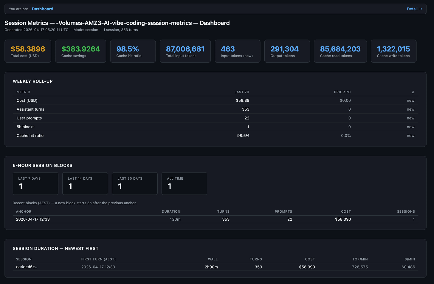 Session-metrics v1.0 just shipped. Its job stays the same - parse Claude Code’s local conversation logs and tell you exactly what each turn cost - but it now answers the question everyone actually asks: am I about to hit my weekly session cap? A new 5-hour session-blocks view groups activity into the same windows Anthropic’s rate limiter uses, with trailing 7/14/30-day counters. An hour-of-day chart and a 7×24 punchcard show when you’re most active, and an optional peak-hour overlay lets you compare your pattern against the community-reported 5–11 AM PT crunch. HTML reports now split into a lightning-fast dashboard page and a separate chart-and-timeline page, so the overview loads instantly even on projects with thousands of turns.