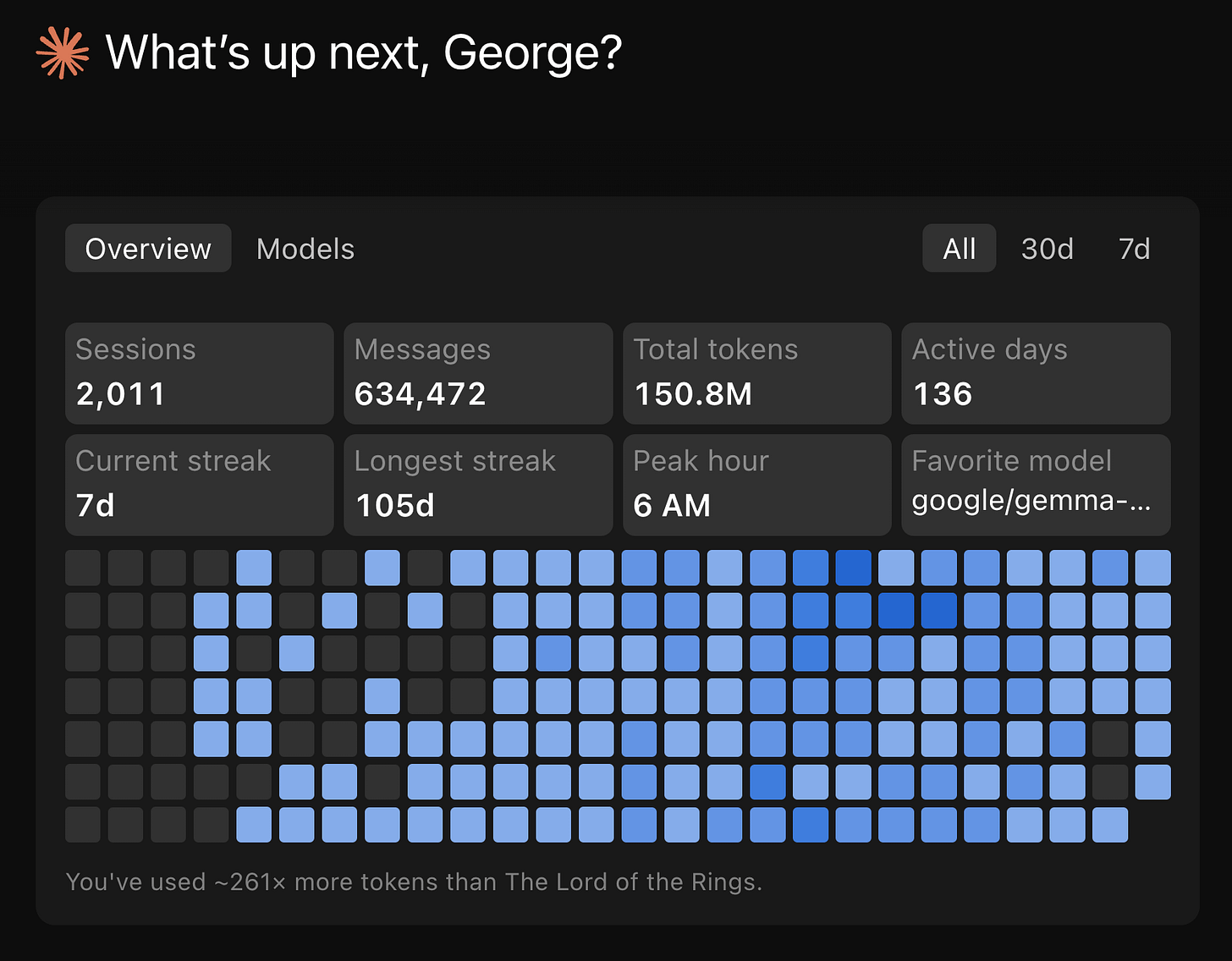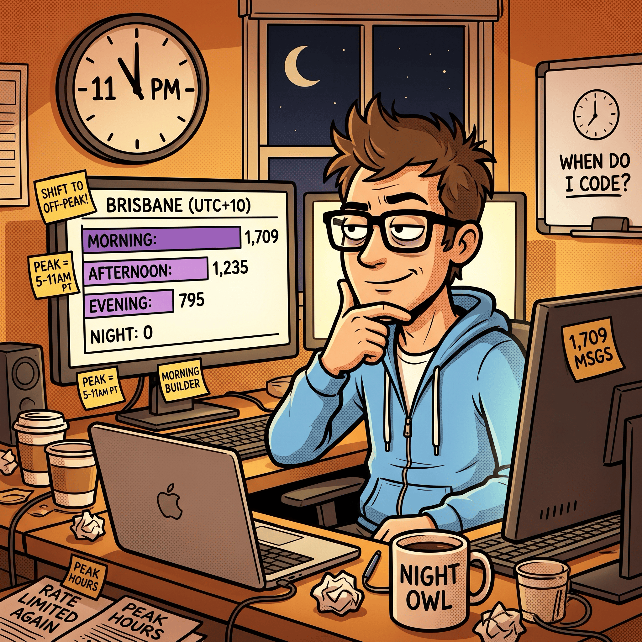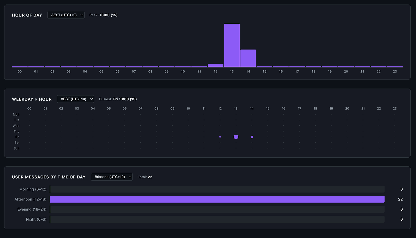 This was the question that changed my behavior. Claude Code has known peak hours: weekdays 5 to 11 AM Pacific Time. During peak, rate limits tighten. If I could see when I actually use Claude relative to those windows, I could decide whether to shift my schedule.
