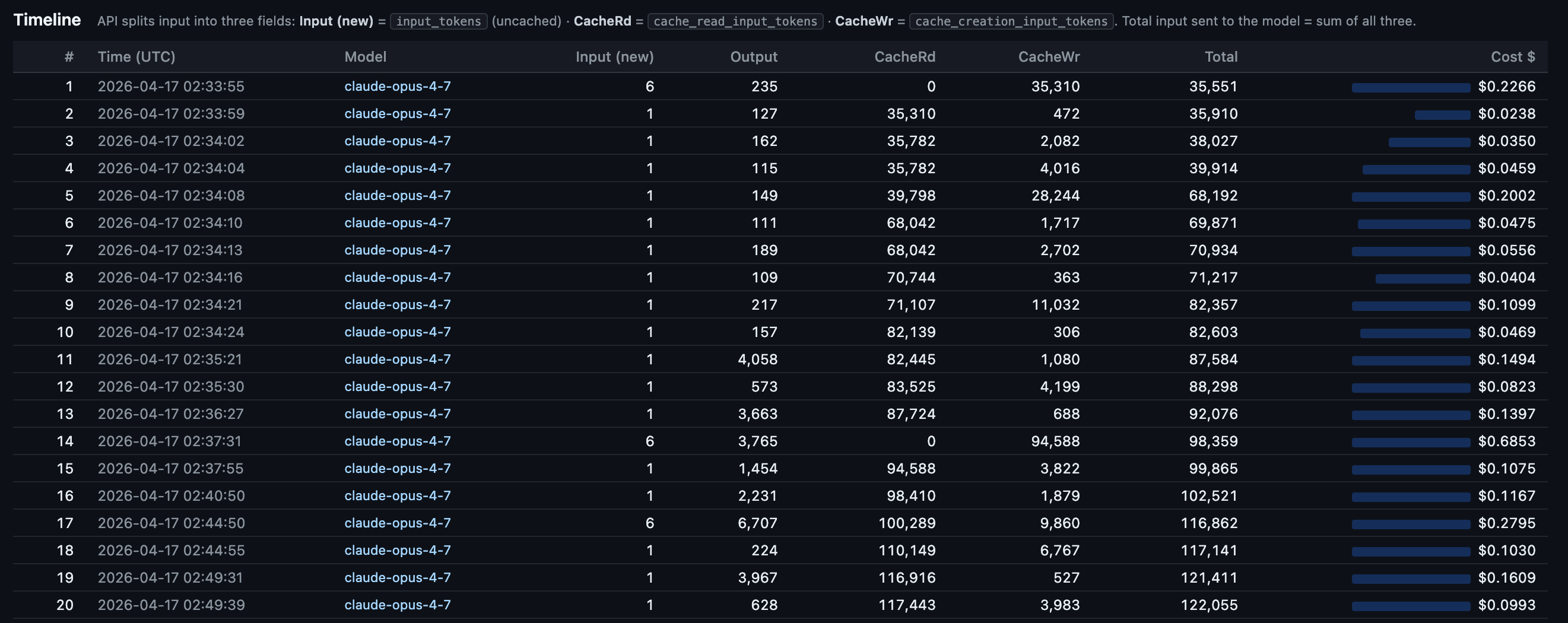 Session metrics turn by turn response drill-down of token consumption and costs. Several times in the session we see a full cache miss - with a full cache write.