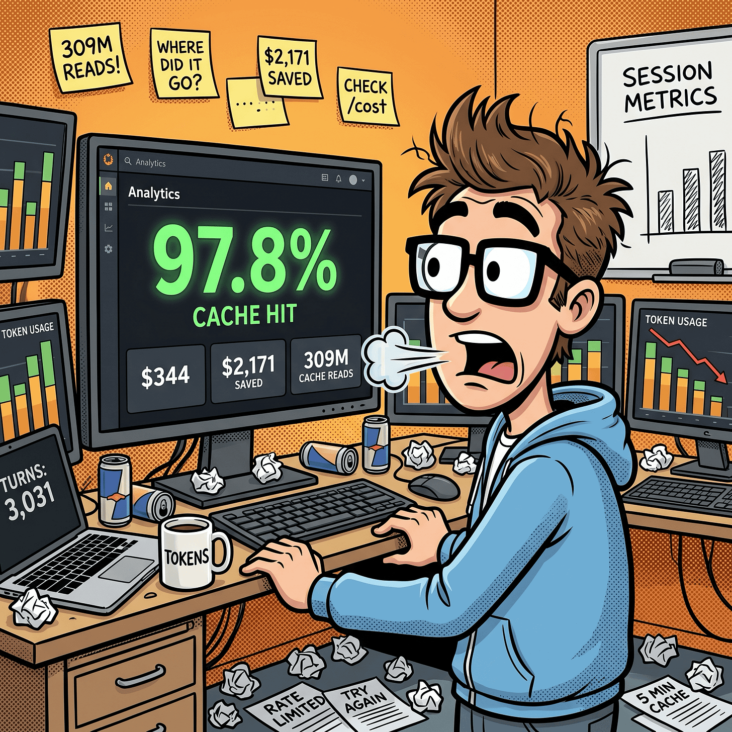 97.8% cache hit rate, $2,171 in savings. My session-metric skill revealed that mid-session model switch can result in a costly prompt token cache miss