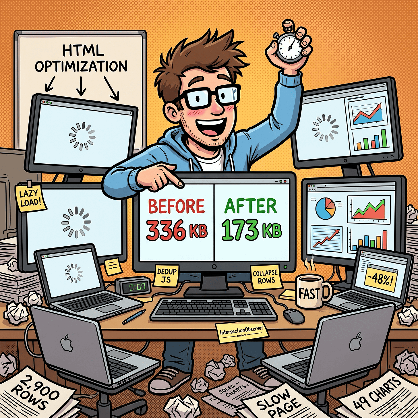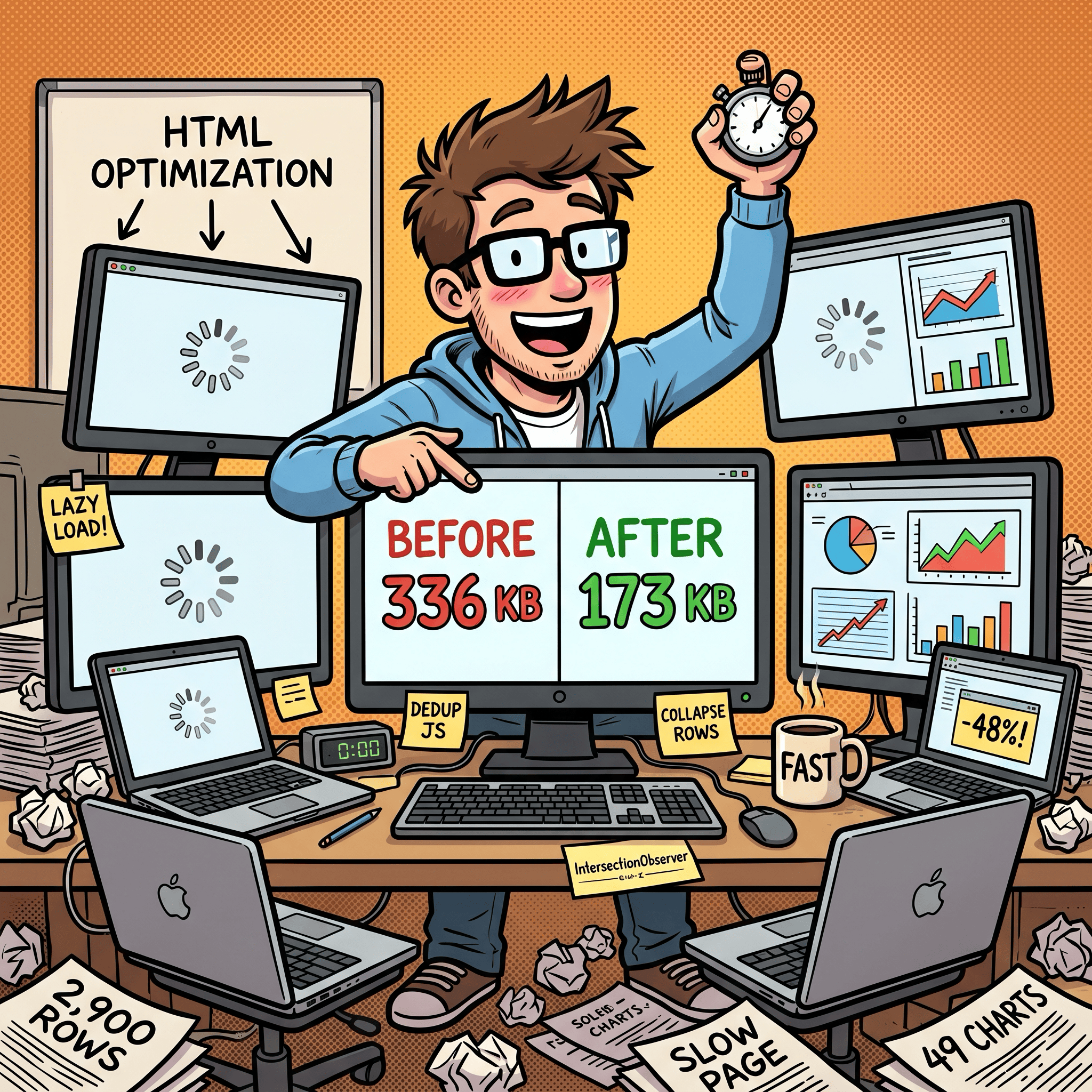 The problem: 49 chart panels, each with its own copy of the Highcharts config. About 336 KB of duplicated JavaScript plus 2,900 table rows rendering on page load.