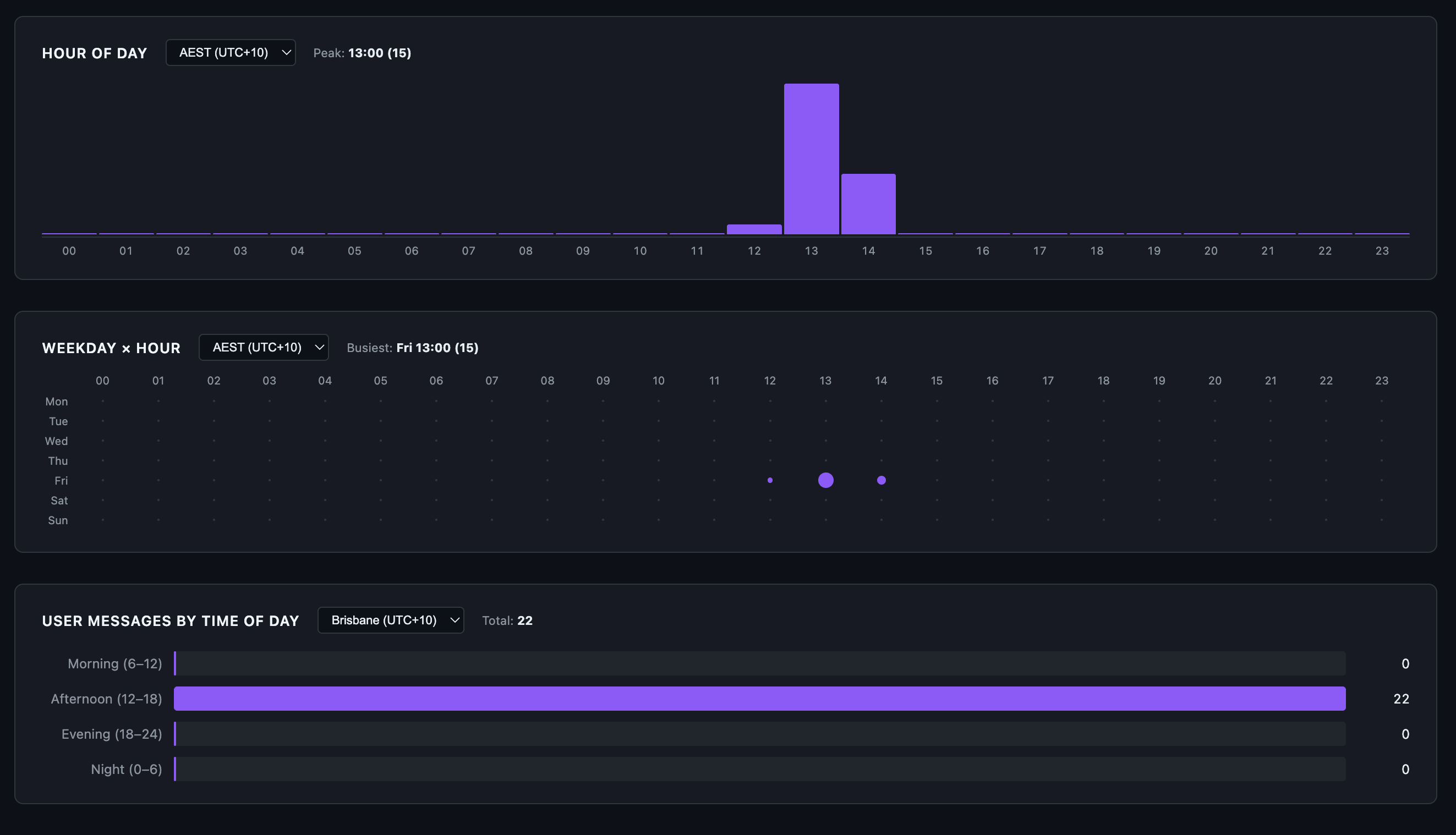 Hour of day, week hour and user messages by time of day for this chat session.