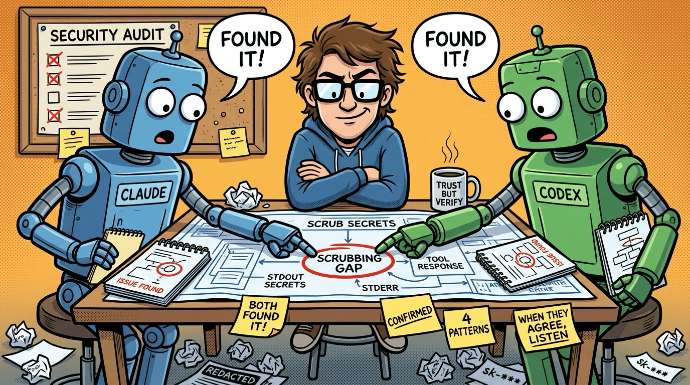Both independently found the same gap: scrubSecrets() covered resources and stderr but missed tool response paths and stdout ingestion. Both also independently discovered that readRunSummary was unscrubbed.