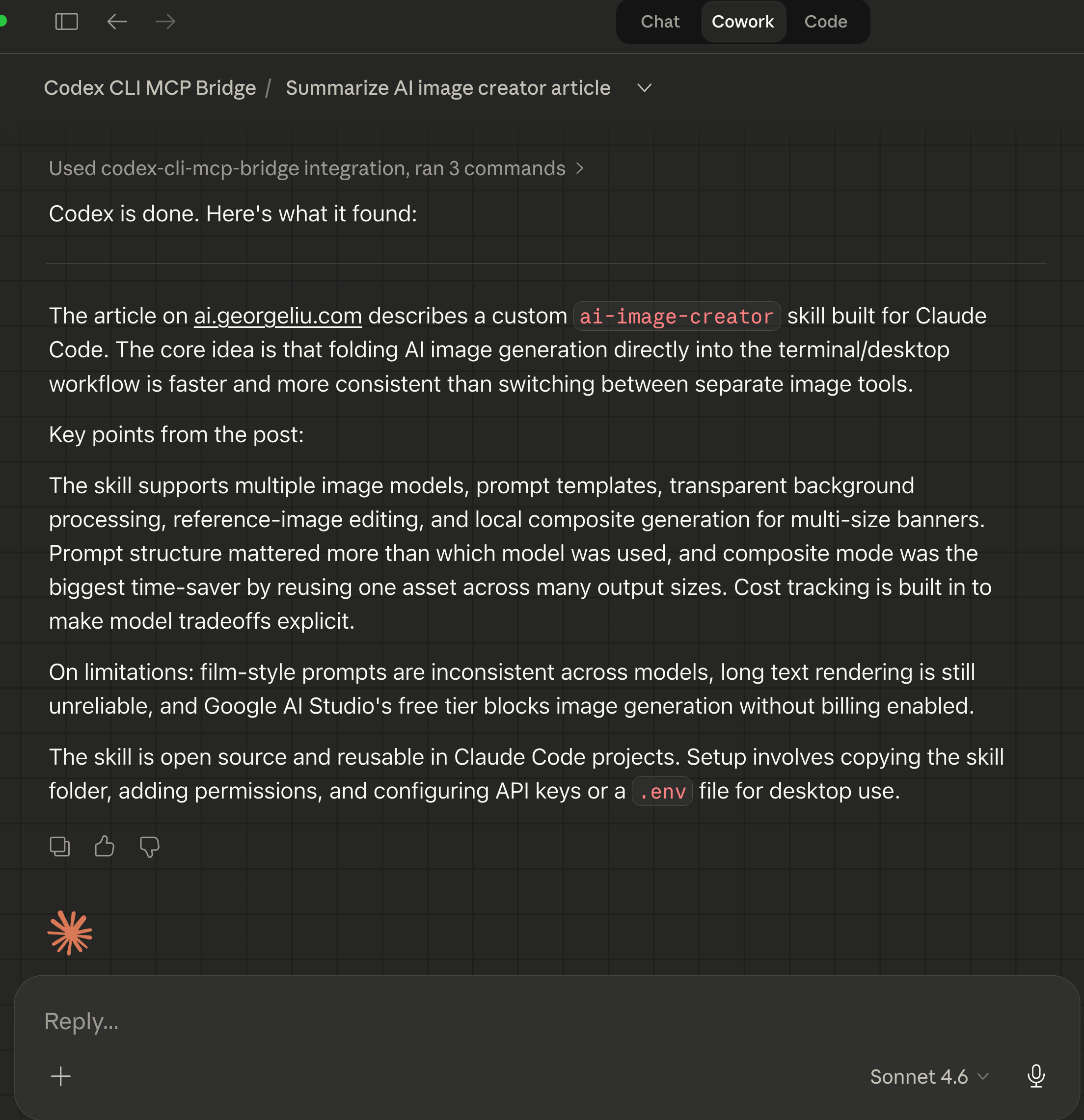 Having a second AI review the first AI’s work is like having a second pair of eyes on a pull request or a draft. Except these “eyes” have different training data, different strengths, and different failure modes. I used this bridge to have Codex critique my Substack article drafts, not just code. The screenshots later in this post show exactly that: Codex reading a full article and returning a structured summary with strengths and weaknesses.