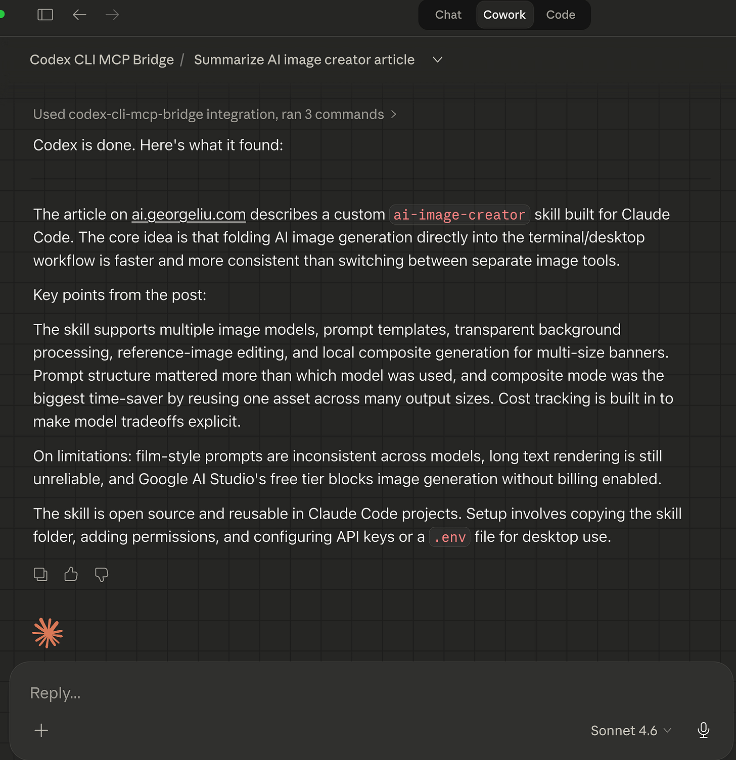 From there, you can ask Claude to delegate tasks to Codex using natural language. Here is what it looks like when I asked Claude Cowork to have Codex read and critique one of my article drafts: