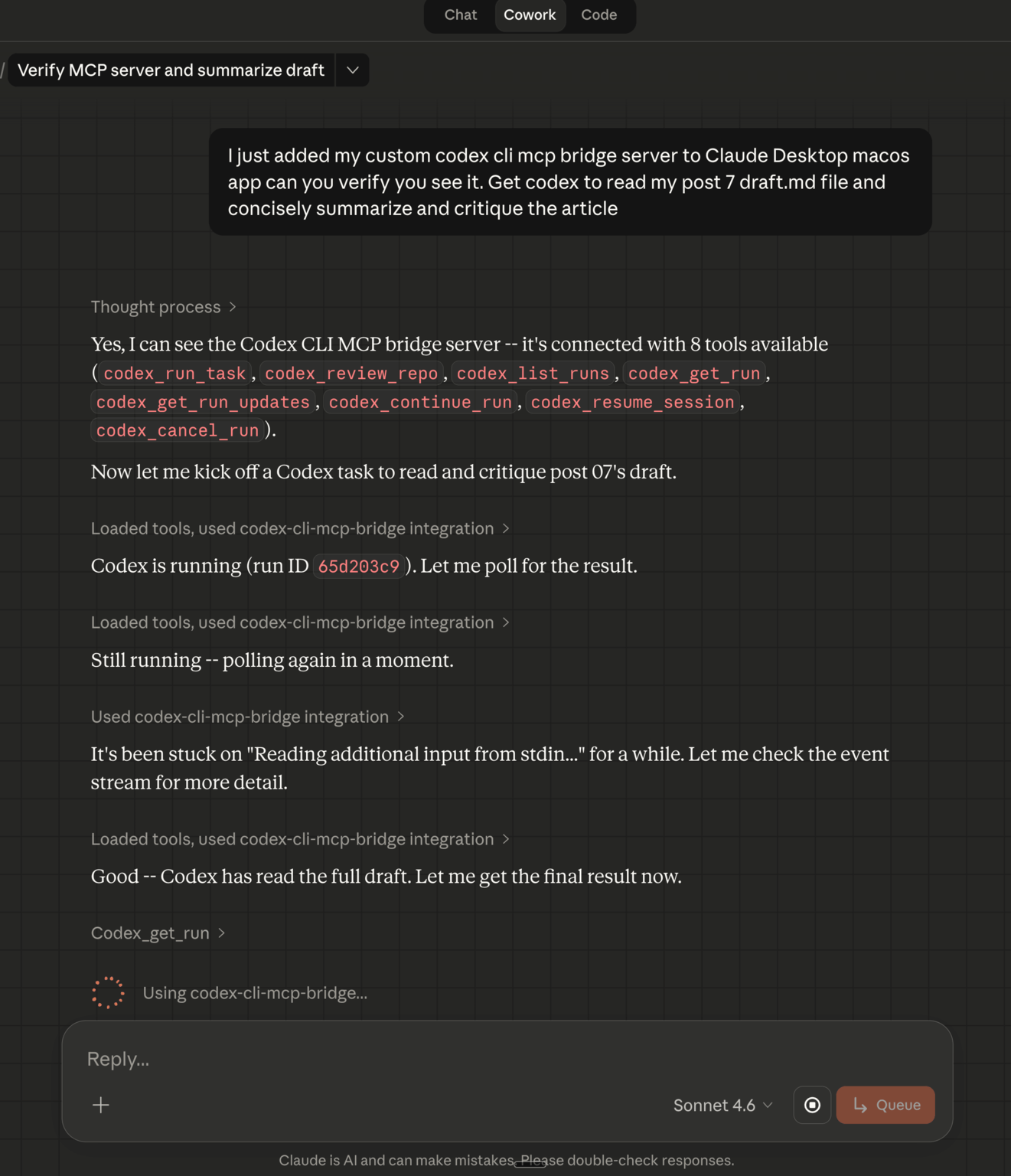 The practical value: I got a GPT-5.4-powered content critique without leaving Claude. The bridge handled all the session management, event streaming, and cleanup transparently.