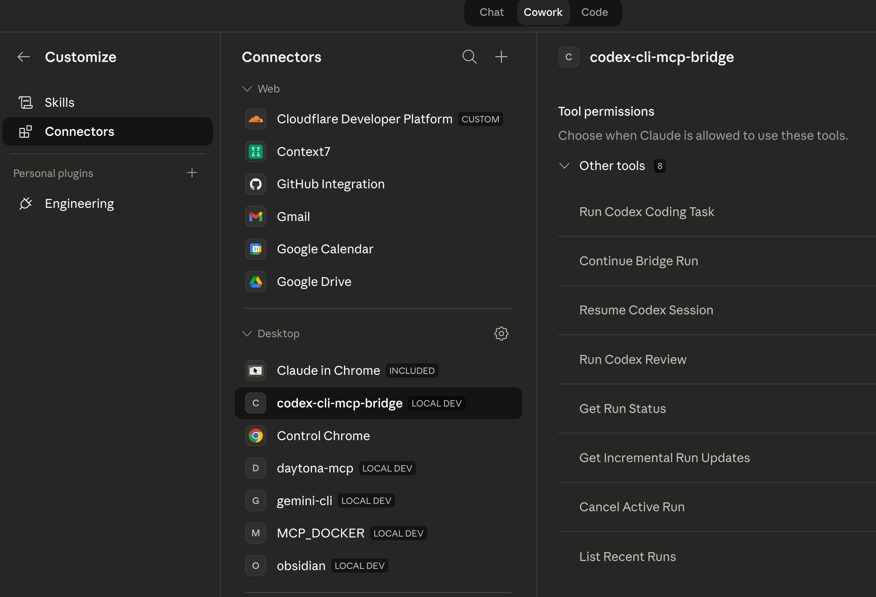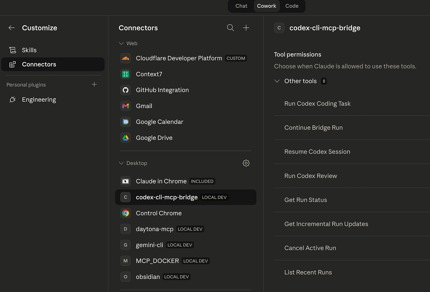 Once connected, the bridge appears as a connector in Claude Desktop’s Cowork mode with 8 tools available.