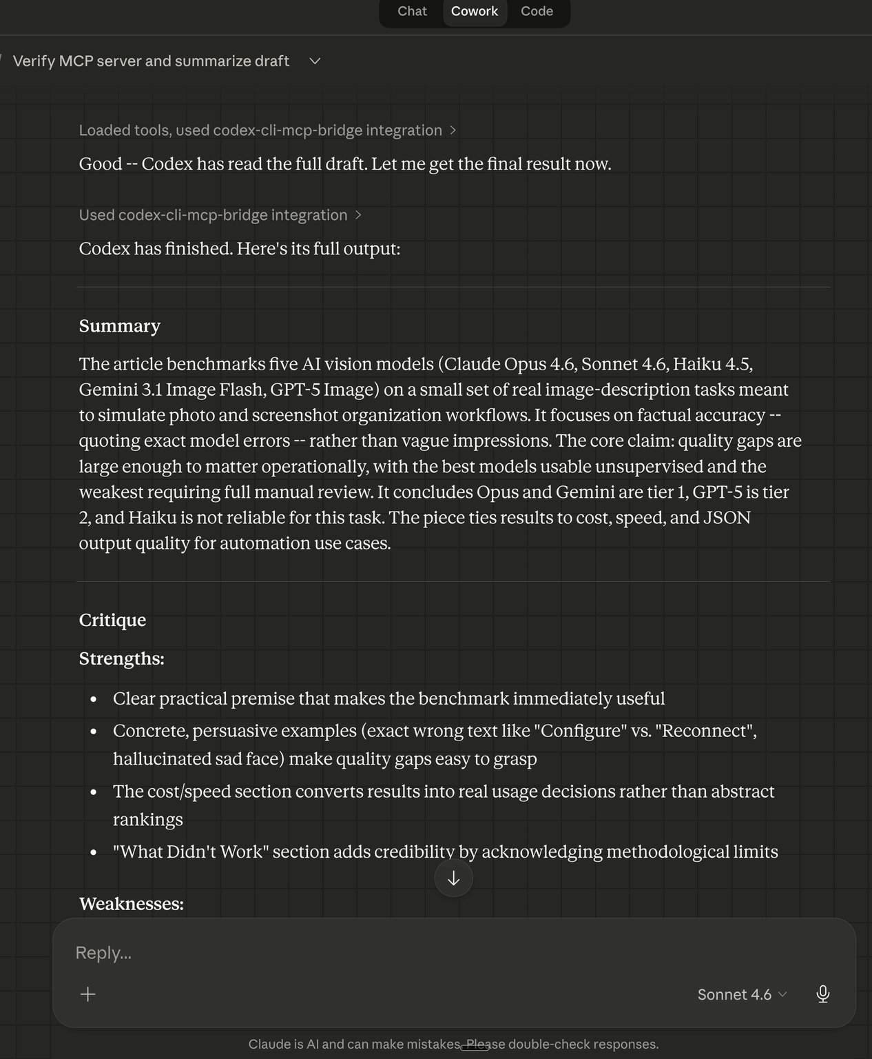 Codex reads the full draft, produces a structured summary and critique with strengths and weaknesses, and the results flow back into the Cowork conversation: