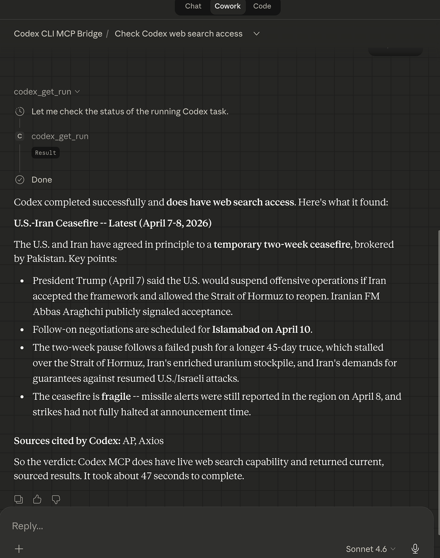 I can now also get Claude Cowork to offload web searches and web browsing summarization to Codex CLI MCP bridge’s GPT-5.4.