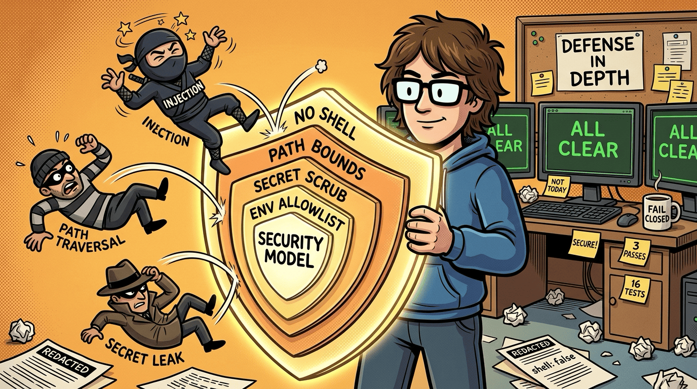 A security model with no-shell subprocess spawning, path traversal protection, environment allowlisting, and secret scrubbing