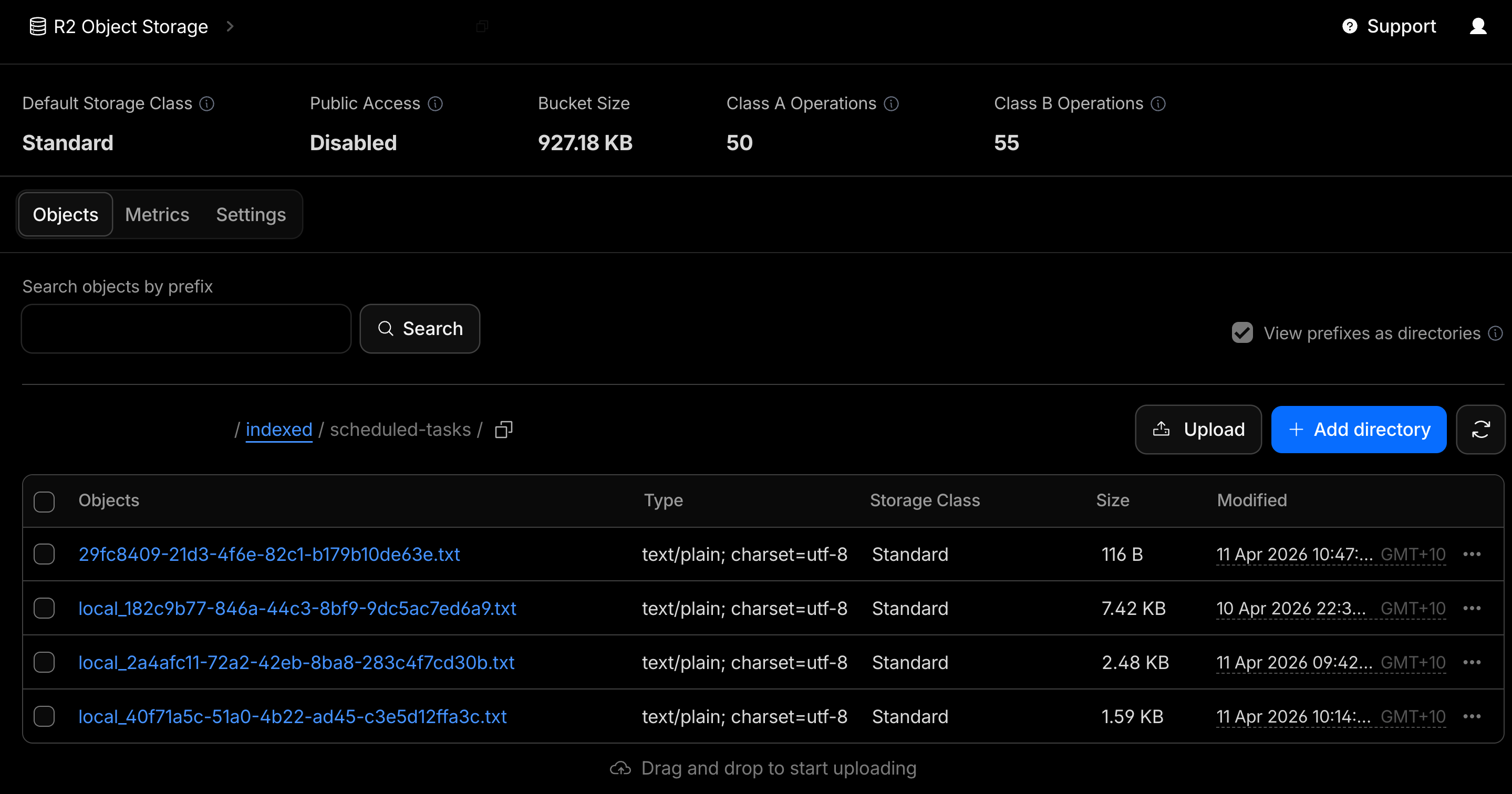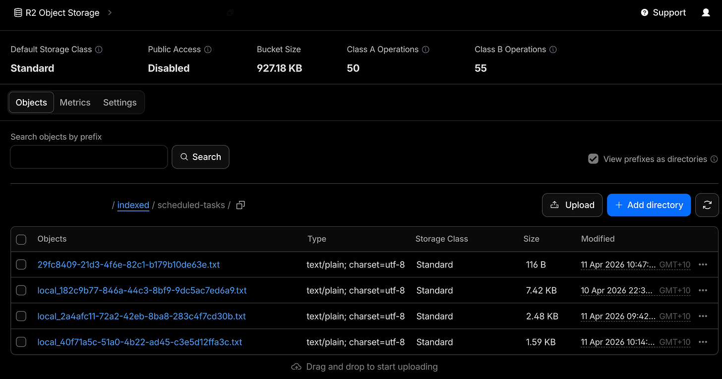Cloudflare AI Search RAG’s R2 S3 compatible bucket with Claude Cowork projects’ session backups for just my Scheduled Tasks project and AI Search RAG triggered job indexing of text converted session logs to Cloudflare Vectorize database: