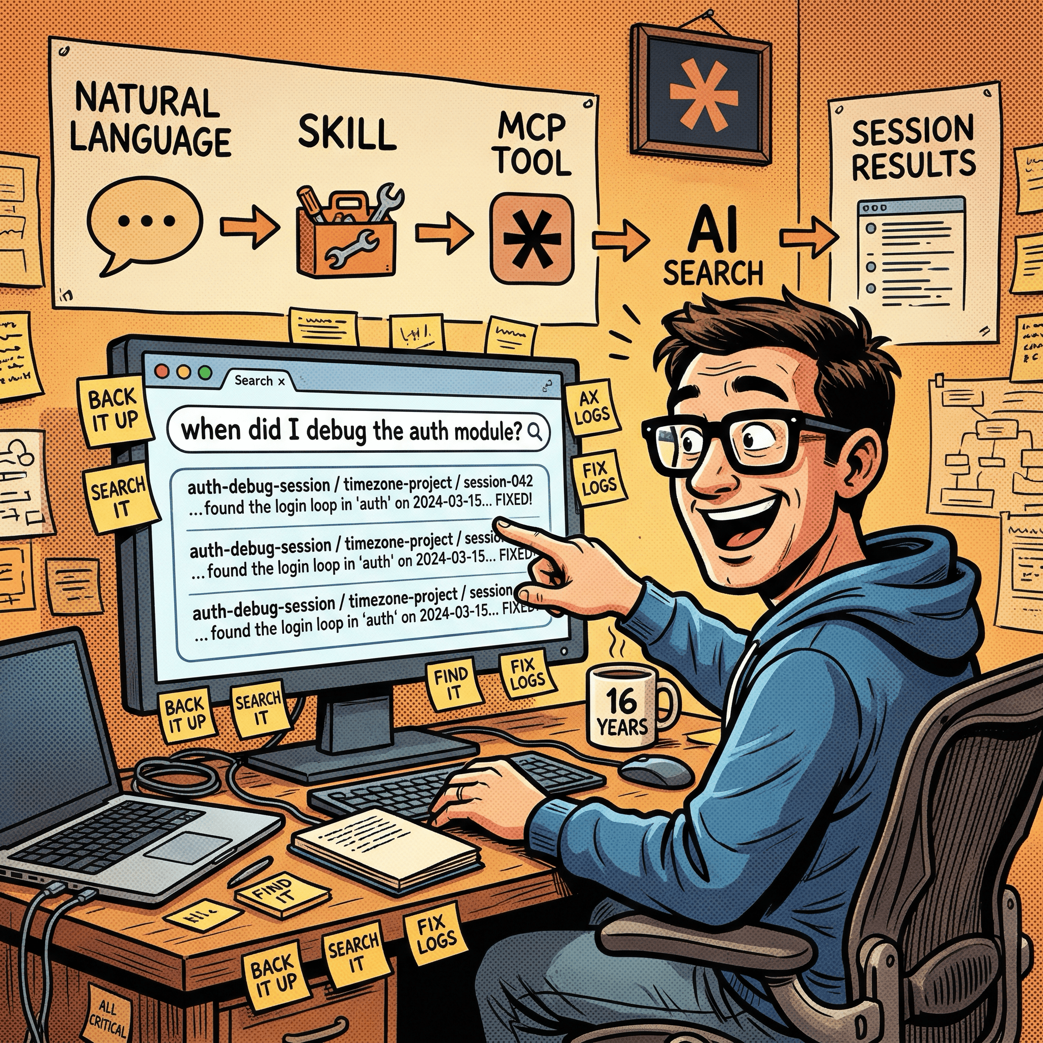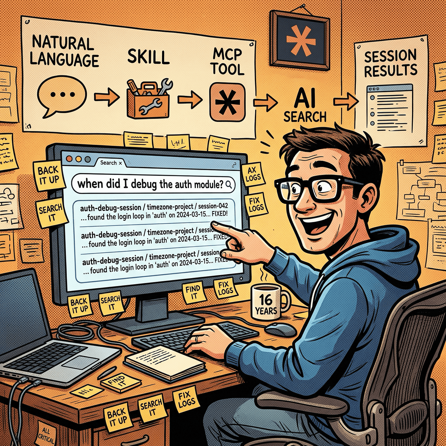 search_sessions – Takes a natural-language query. Calls search() on Cloudflare AI Search (not aiSearch() – the ranked-chunk retrieval path, not the LLM-synthesis path). Groups chunk results back into session-level hits. Cheaper and faster than synthesis for this use case.