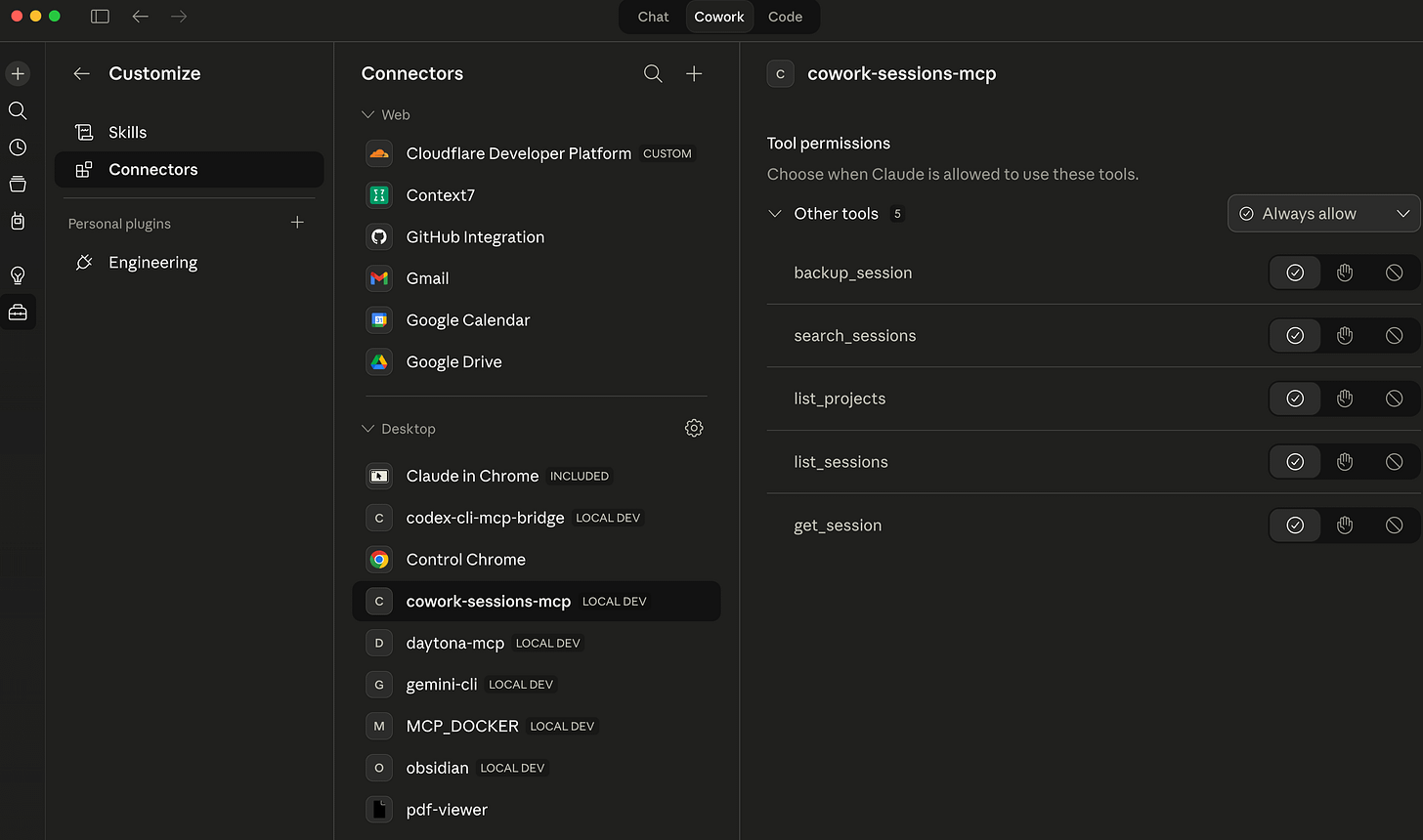 Claude Cowork connectors list now shows cowork-sessions-mcp: