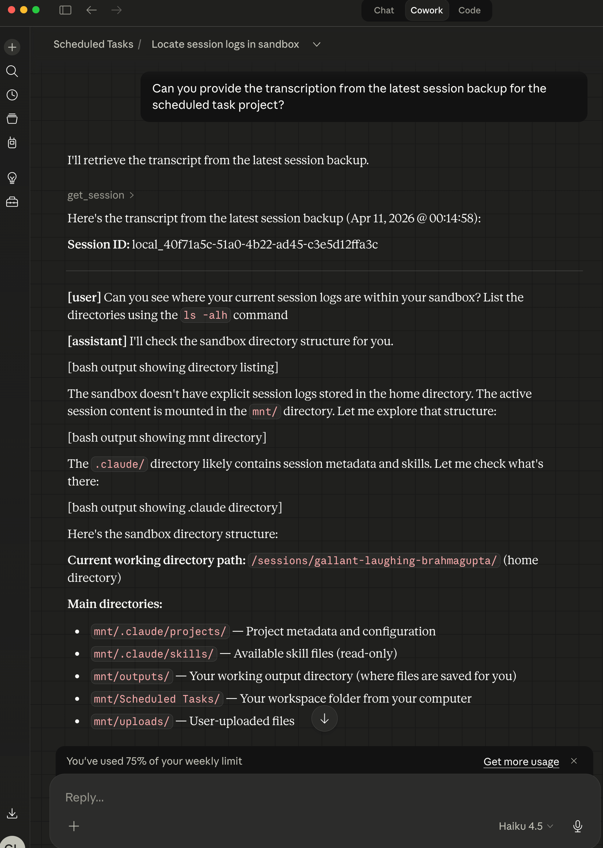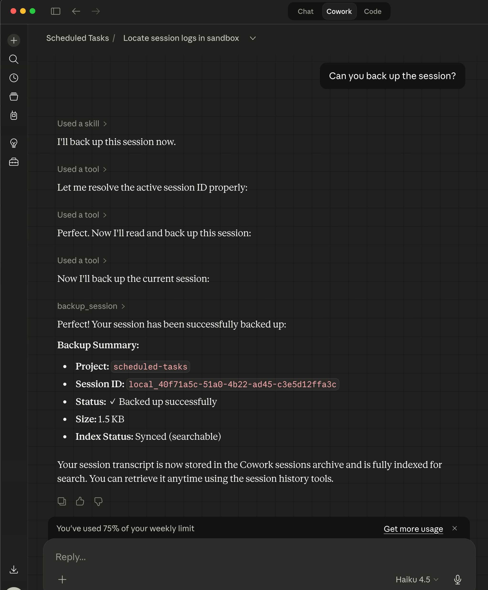 Using cowork-session-mcp and cowork-session-backup MCP and skill bundle to read a saved Claude Cowork project session backup chat log: