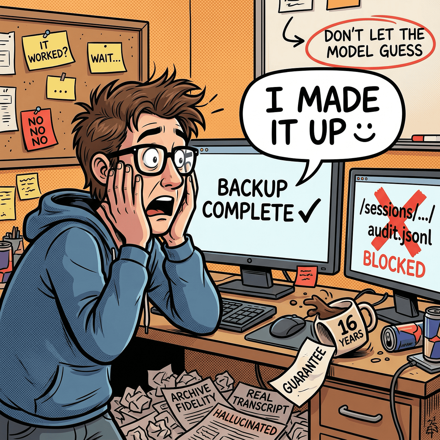 The model produced a backup. Except the backup was not the transcript. It was a summary the model had assembled from context – an AI-written description of the session, filed as an archive of it. The archive fidelity guarantee the whole system was built around had been silently violated on the first real use.