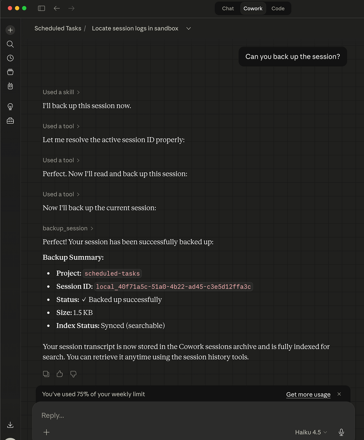 The build was done. Tests passing, smoke script clean, skill installed. I typed “back up this session” into a live Cowork project.