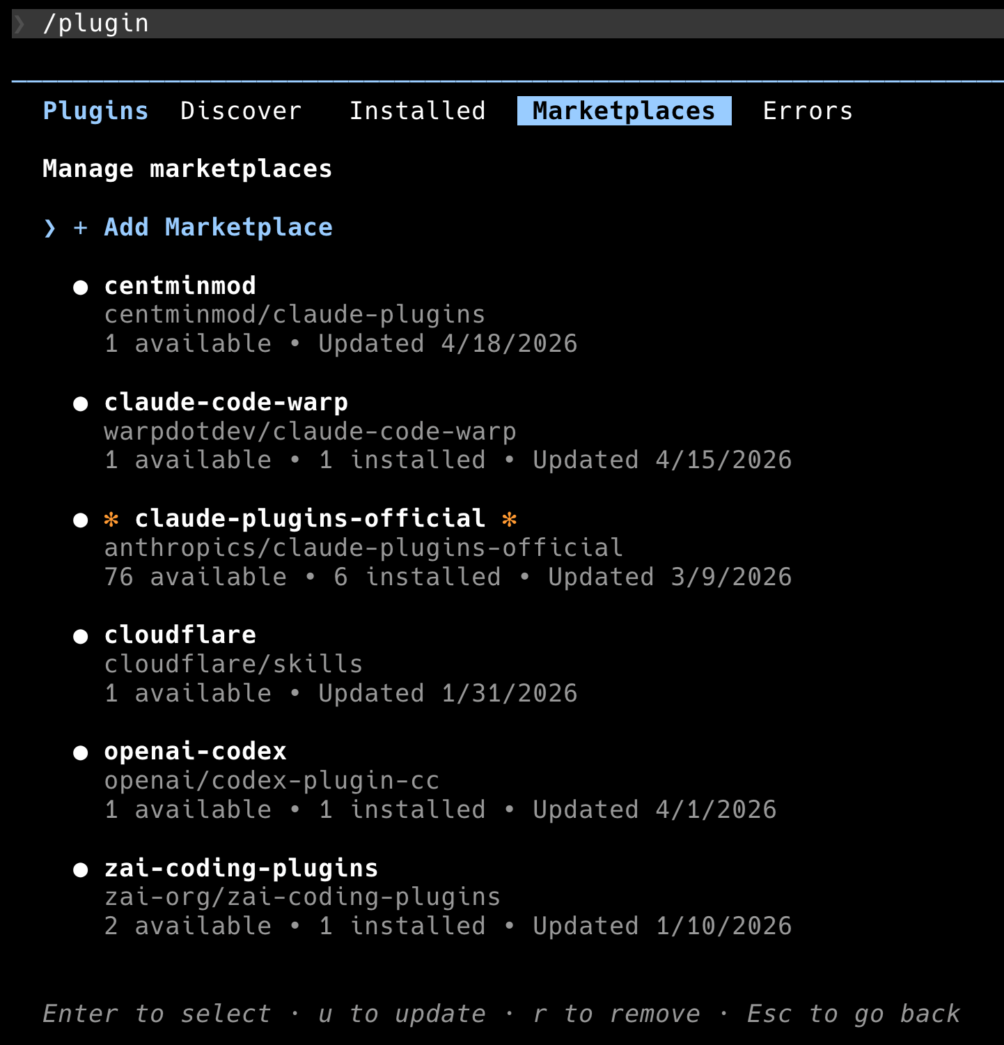 If you type /plugin on its own and tab to the Marketplaces pane, you’ll see centminmod listed alongside any other marketplaces you had configured. In the screenshot below I have six marketplaces registered. Yours will vary.