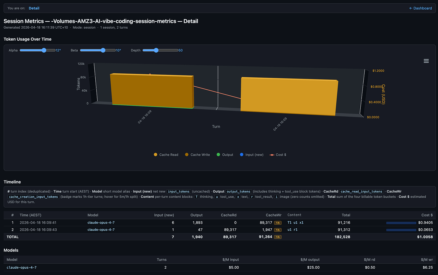 One detail worth flagging. Every turn on a single model produces a single cached prefix. If you switch mid-session from Opus to Sonnet, the new model writes its own cache from scratch and you pay for it. The skill surfaces that as a cache-write spike on the turn right after the switch, which is usually the cheapest “tell” you’ll get.