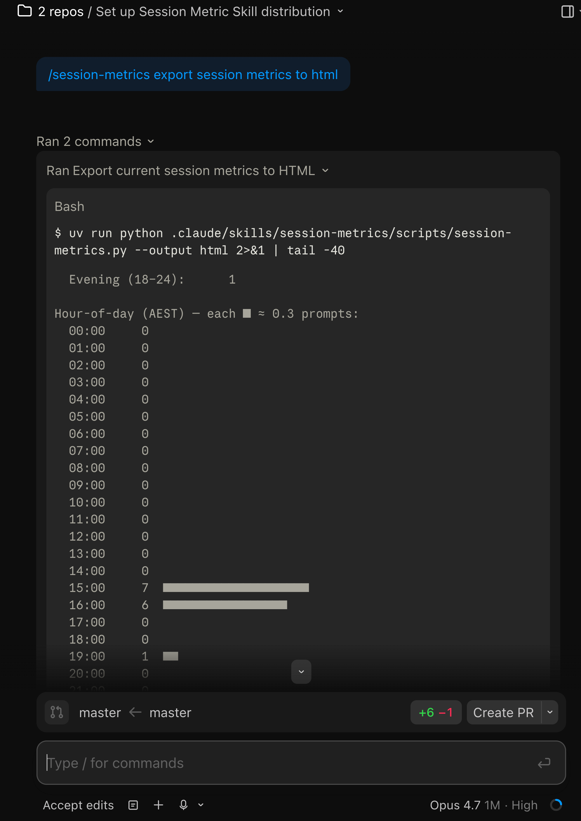 /session-metrics:session-metrics export session metrics to html/session-metrics:session-metrics export entire project's session metrics to htmlThe namespace prefix (session-metrics:) is how plugin skills avoid colliding with personal-scope skills. If you also have a direct-copy version of session-metrics installed at ~/.claude/skills/, both will show up in the completion list and both can co-exist.