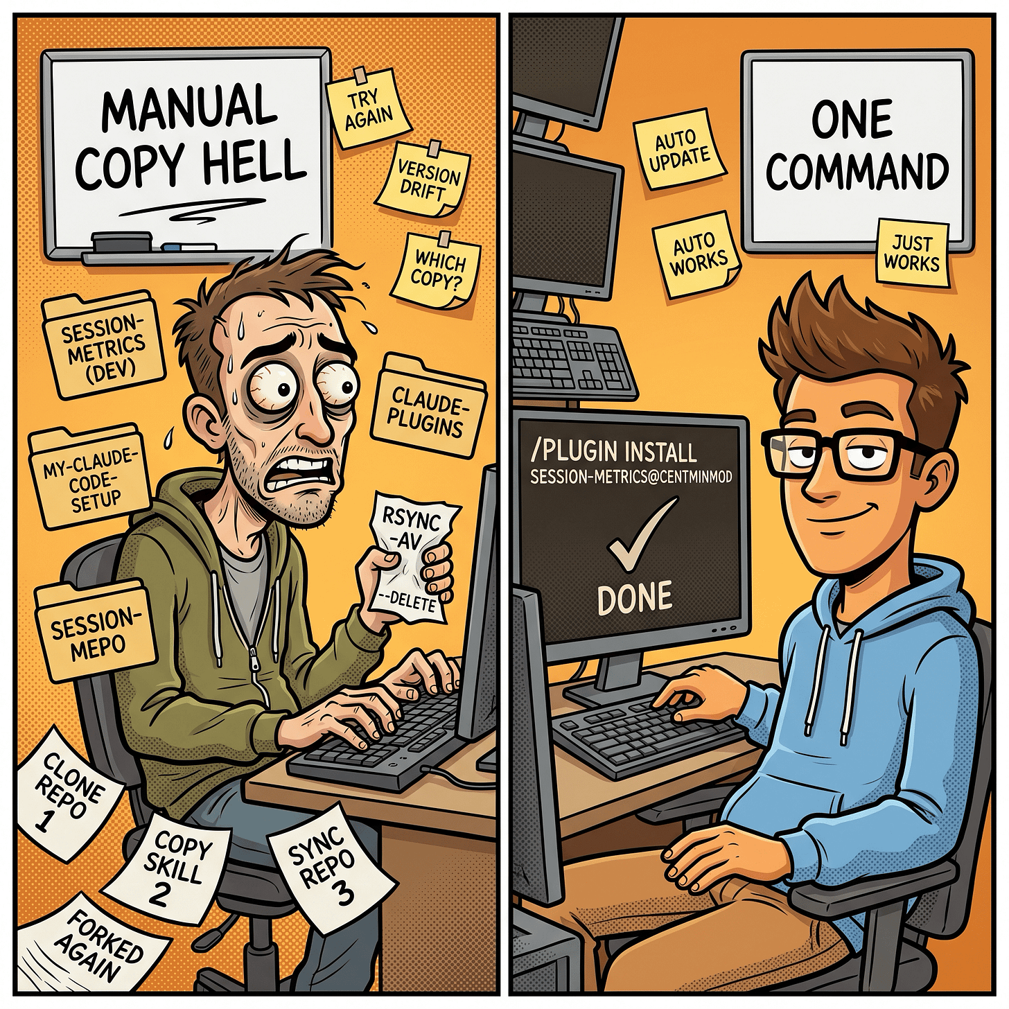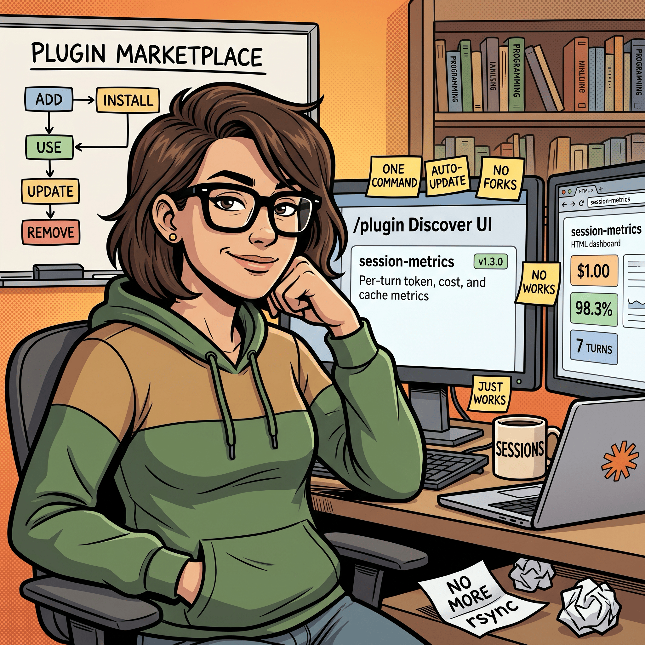 Before the marketplace existed, sharing a Claude Code skill meant one of two things. Either I pointed people at my-claude-code-setup and asked them to cp -r .claude/skills/session-metrics ~/.claude/skills/, or I handed them the repo and they took a copy that went stale the moment I pushed the next fix. Neither route had versioning. Neither route had auto-updates. And neither route survived me renaming a flag or bumping the pricing table.