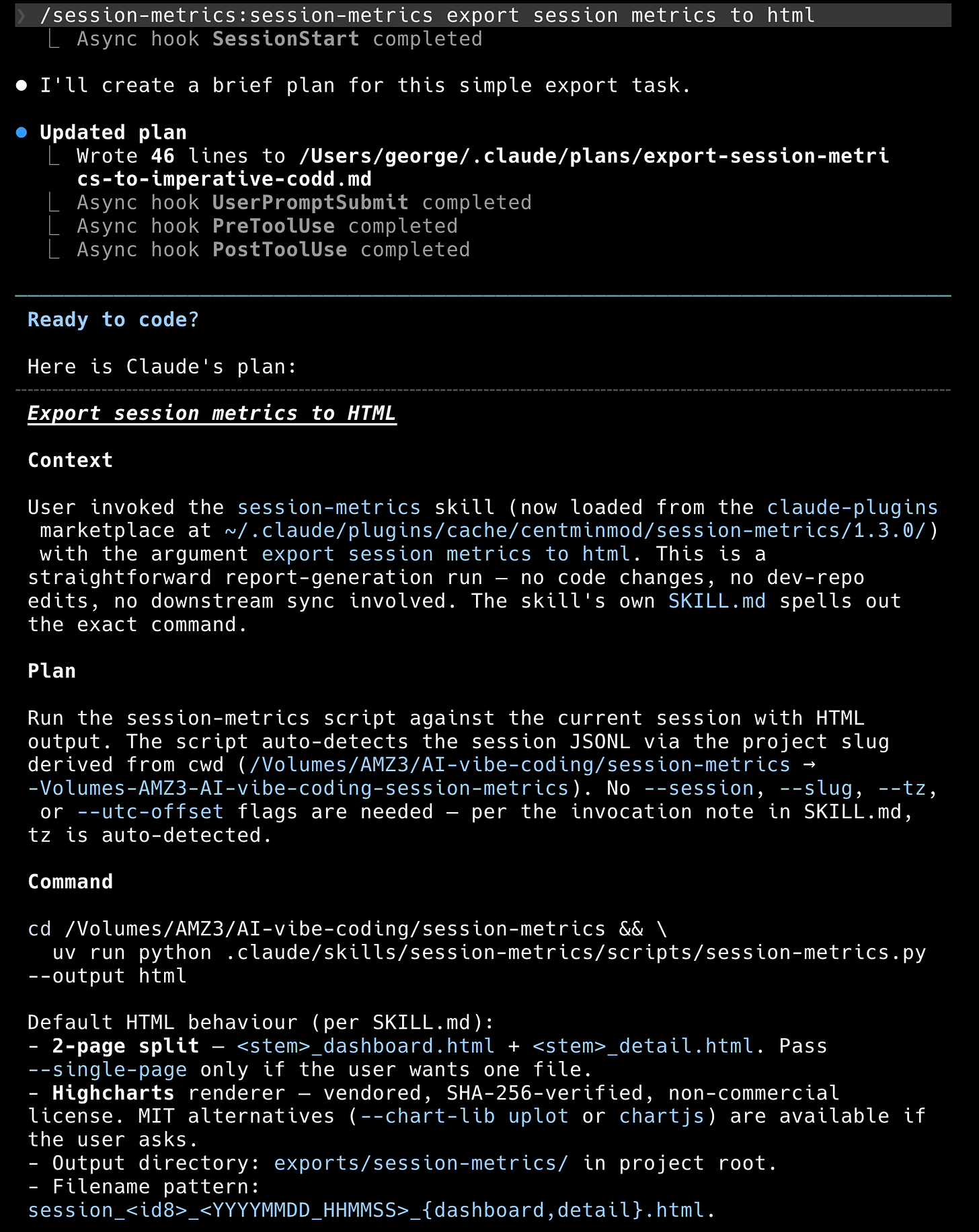 If you are in plan mode, Claude will build a plan first (this is Claude Code’s default pre-execution step). The plan lays out the context, the command, the default HTML behaviour per SKILL.md (2-page split, Highcharts renderer, output directory), and what it is and isn’t doing on this run. You get a chance to approve, edit, or redirect.