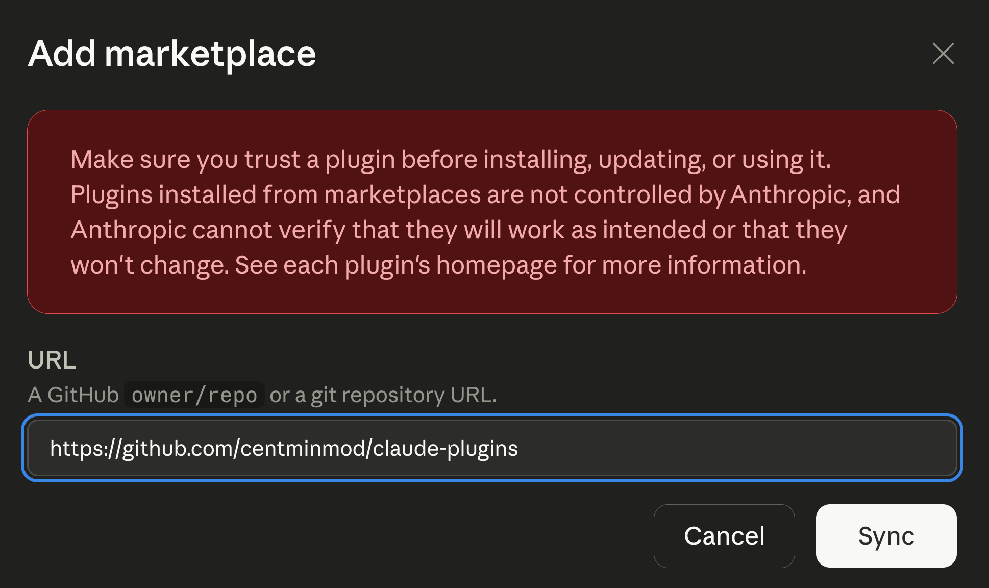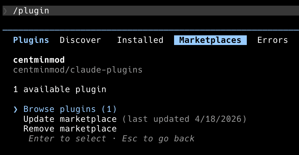 Claude Code’s /plugin marketplace system fixes both. I add the marketplace once. Claude Code fetches the manifest, stores it in ~/.claude/plugins/cache/centminmod/, and handles the install into a namespaced slot so it doesn’t collide with anything I already had locally. When I bump the version, users pick it up on the next update.