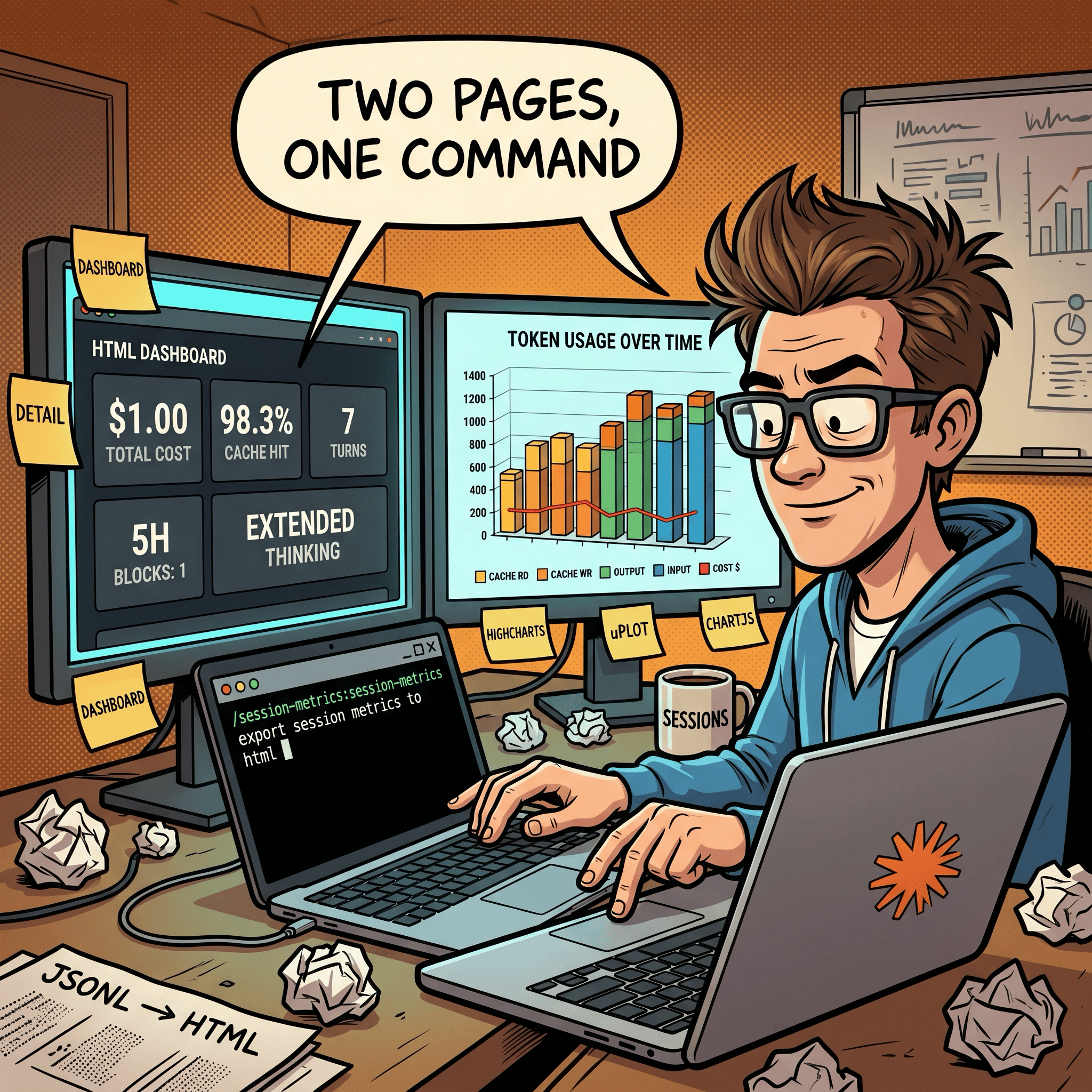 ... session-metrics.py --output html --chart-lib chartjs # MIT-licensed