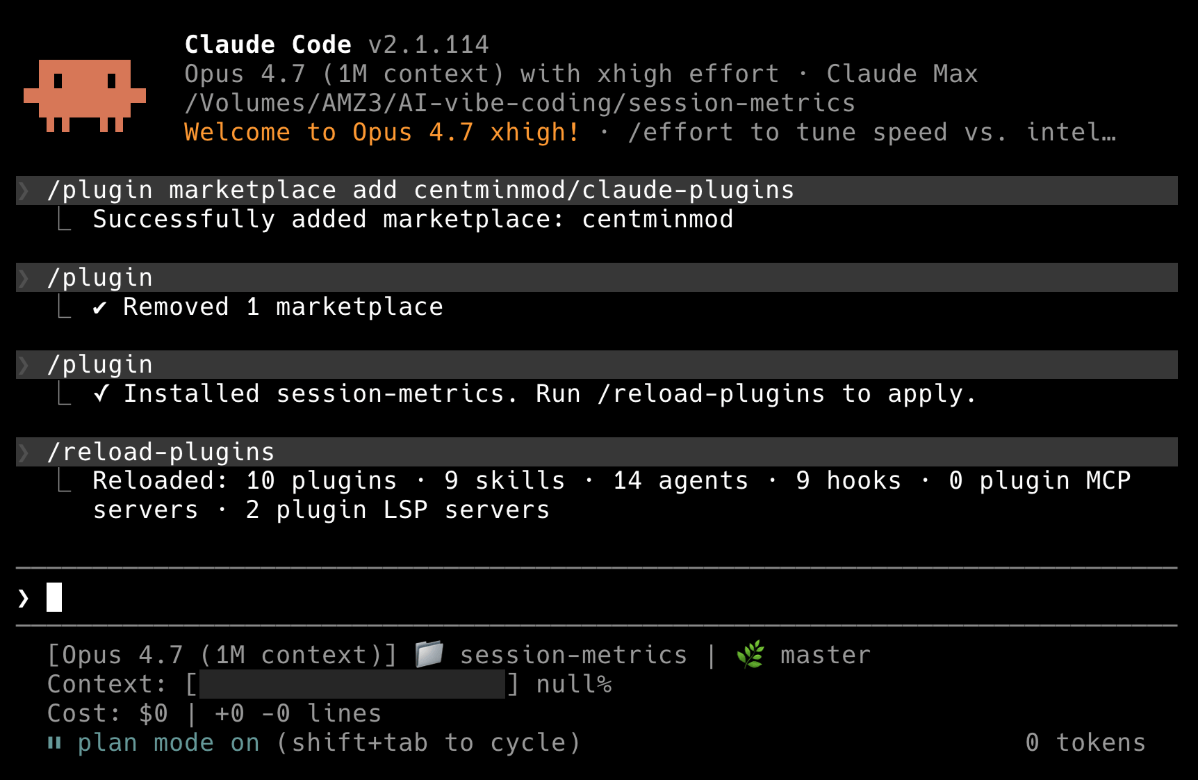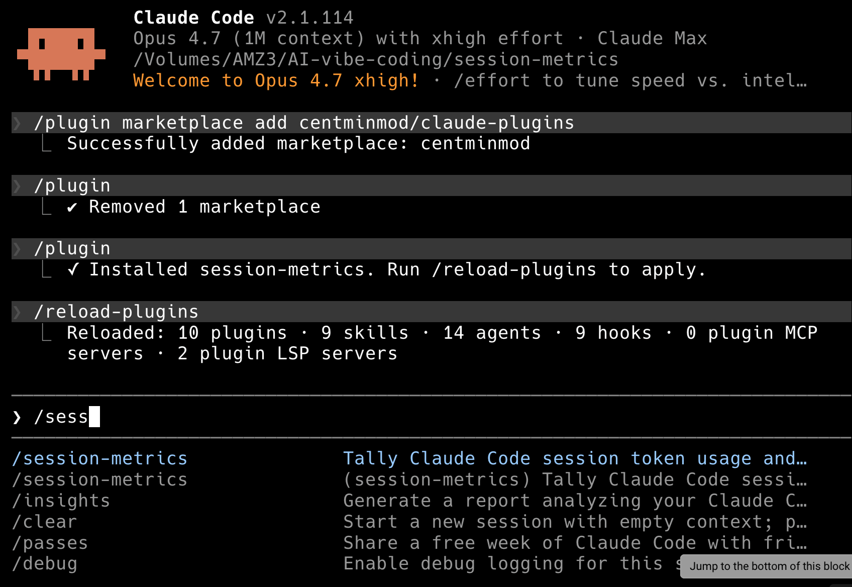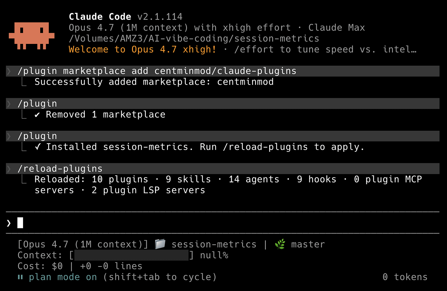 Or just type /plugin install session-metrics@centminmod again. Claude Code treats that as “update to latest”. Run /reload-plugins afterwards and the new version is live.