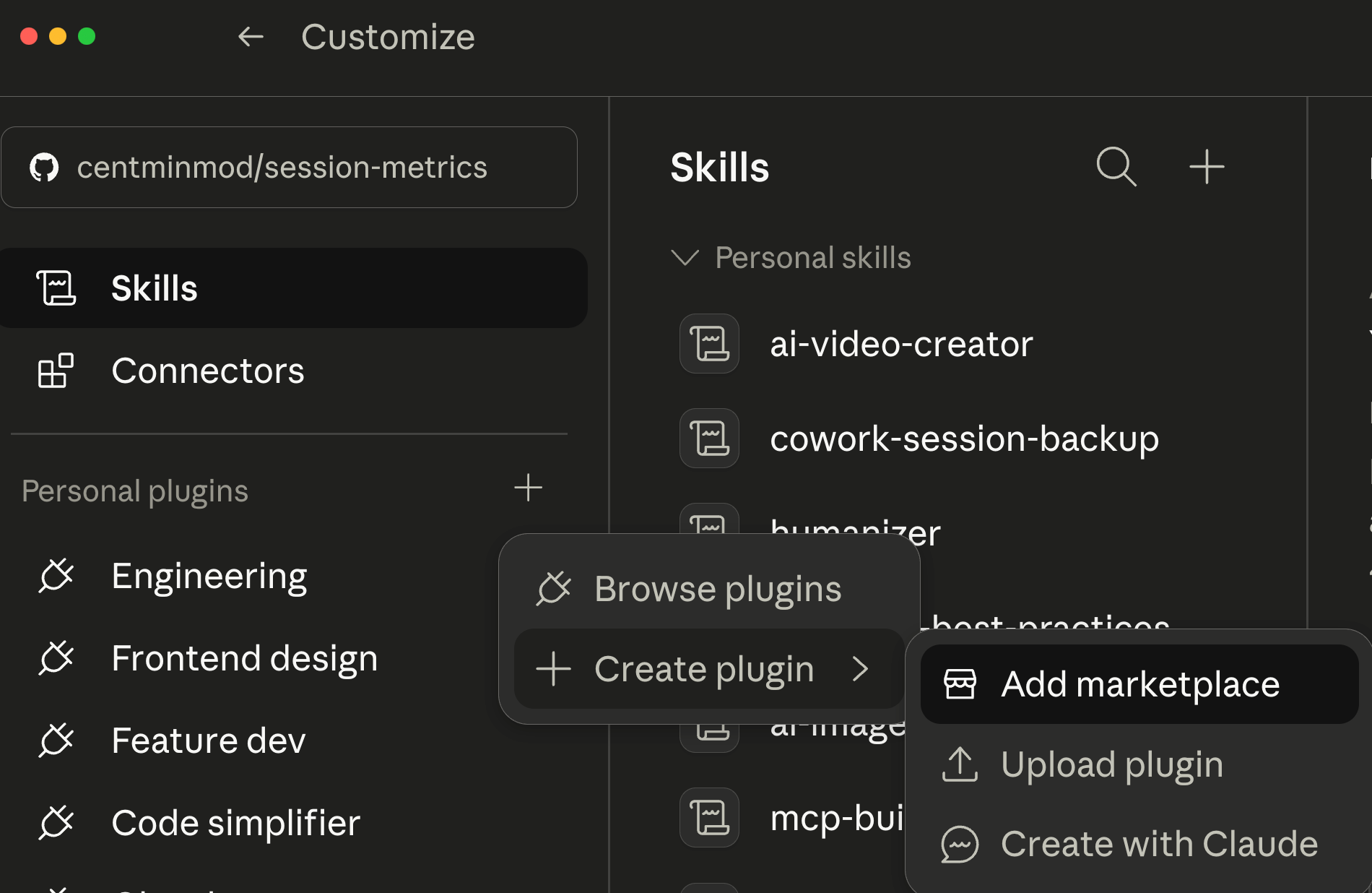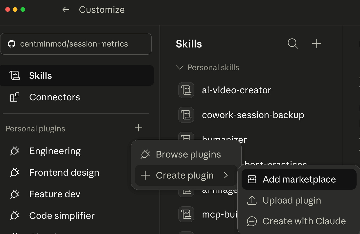 Customize → Personal plugins → Create plugin → Add marketplace