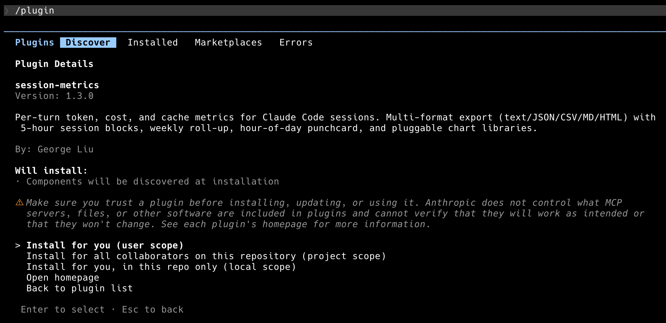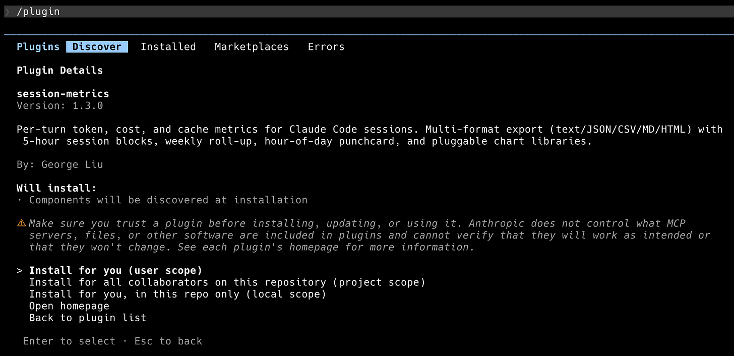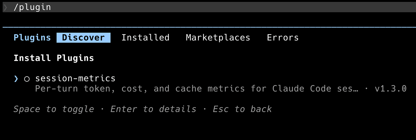 /plugin install session-metrics@centminmod does the install directly. If you’d rather browse, /plugin plus the Discover tab shows every plugin across every marketplace you’ve added. session-metrics shows up there with its version and a one-line description.