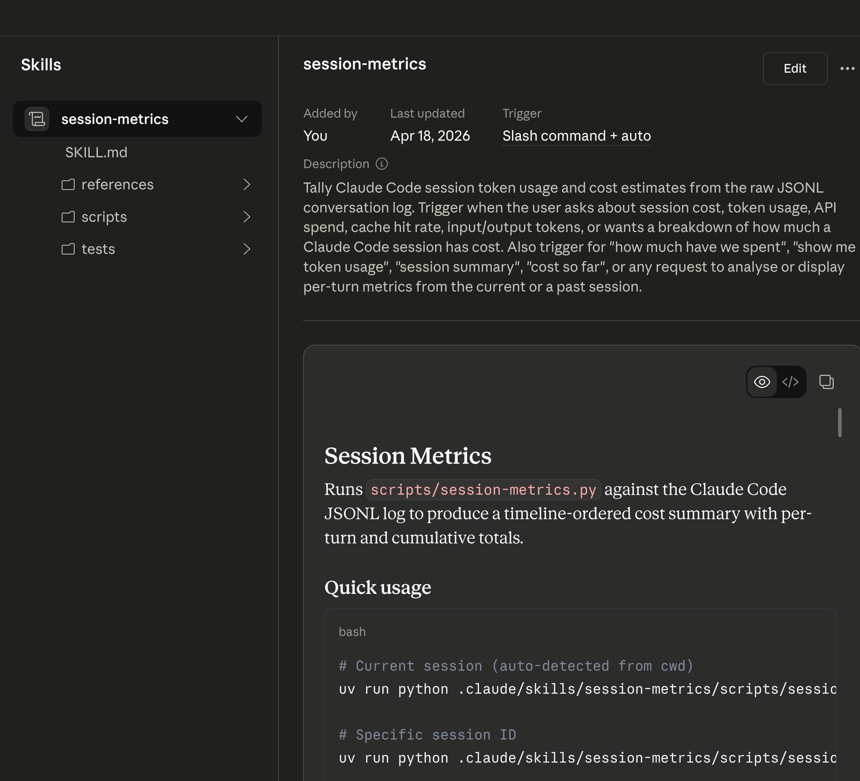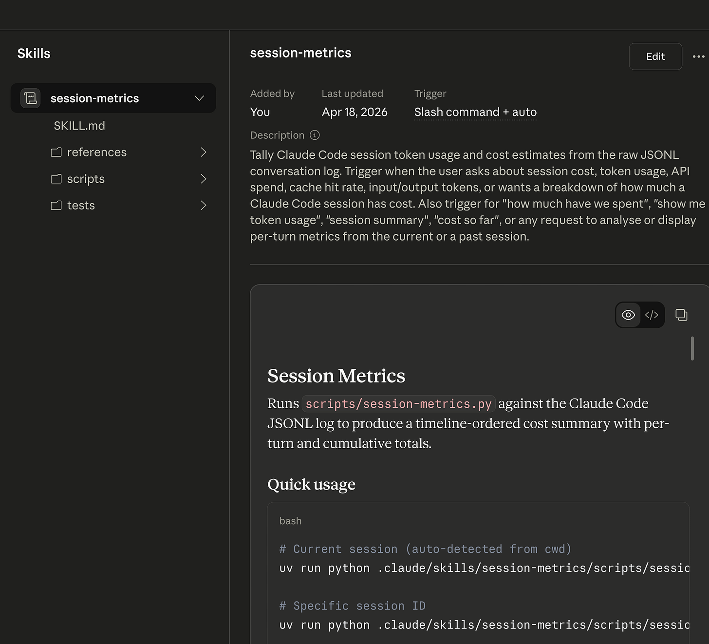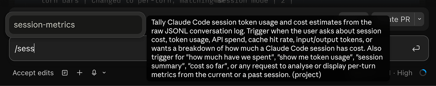 Natural language first. The skill’s description tells Claude to auto-trigger on questions like how much has this session cost?, show me token usage, or what did each turn cost?. In practice, anything that sounds like a cost or cache question in the current project fires the skill. Claude reads the SKILL.md, figures out the right flags, runs the Python script, and hands back the output.