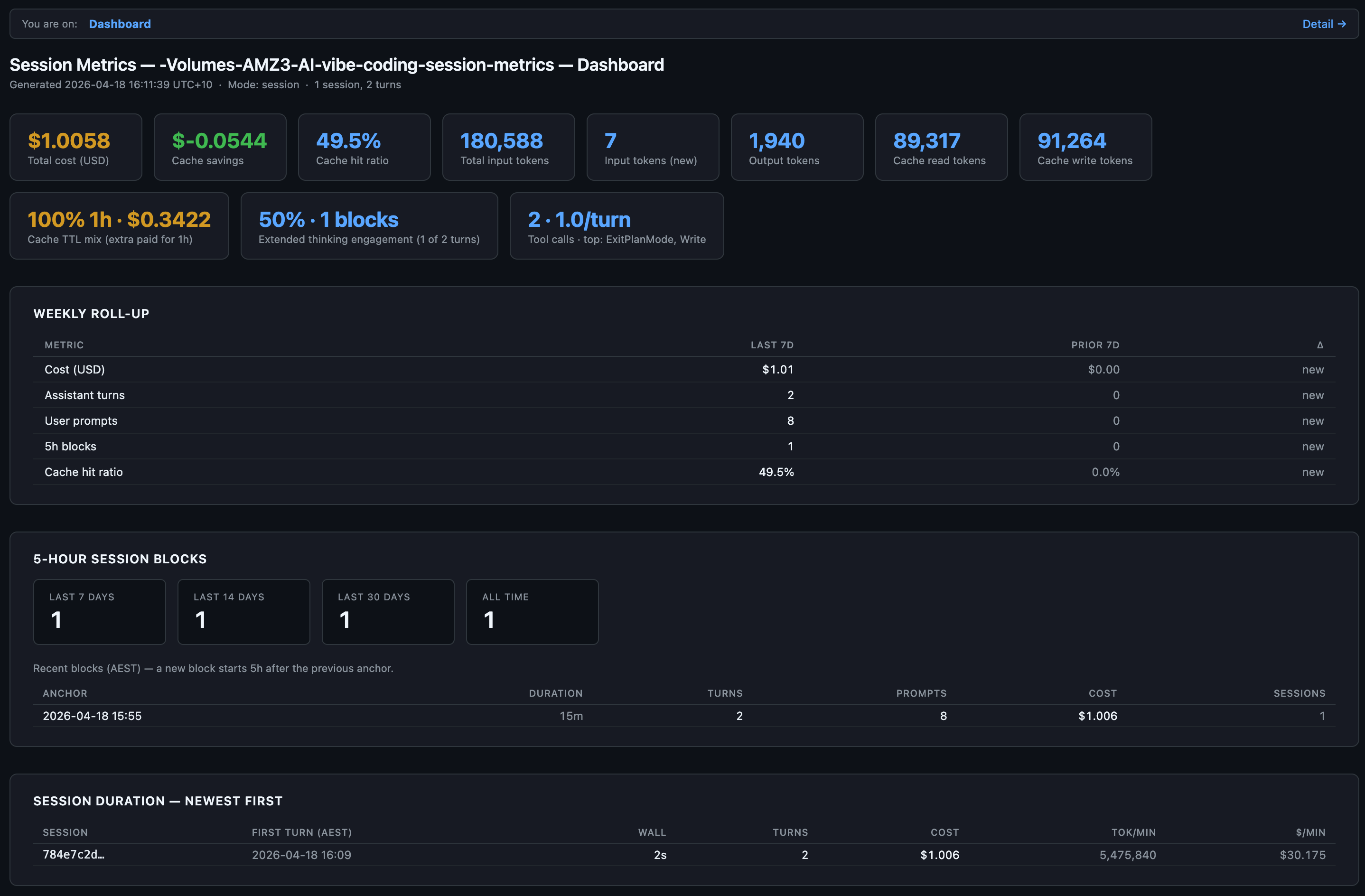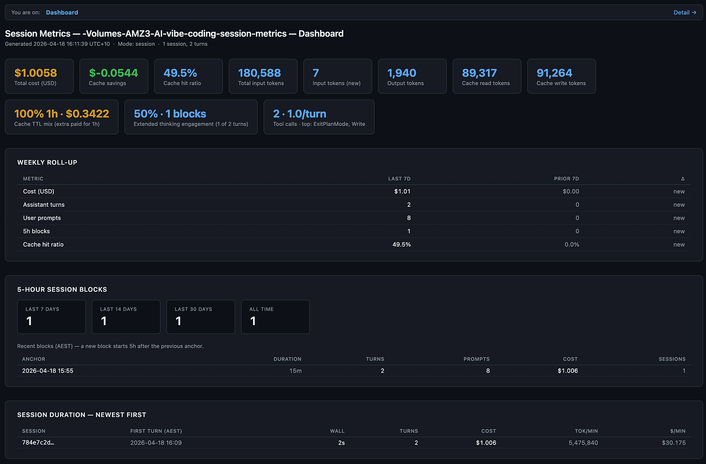 Every card tells a different part of the story. Total cost and cache savings are the money line. Cache hit ratio tells you whether the prefix is holding (anything above 90% is healthy on a warm session). The “1h” badge under Cache Write and the “100% 1h” card mean every cache write on this session paid the 1-hour TTL premium, which is correct for a Max plan. Extended thinking engagement reports that 1 of 2 turns used adaptive thinking (50%), which is Opus 4.7’s default behaviour when /effort xhigh is active.