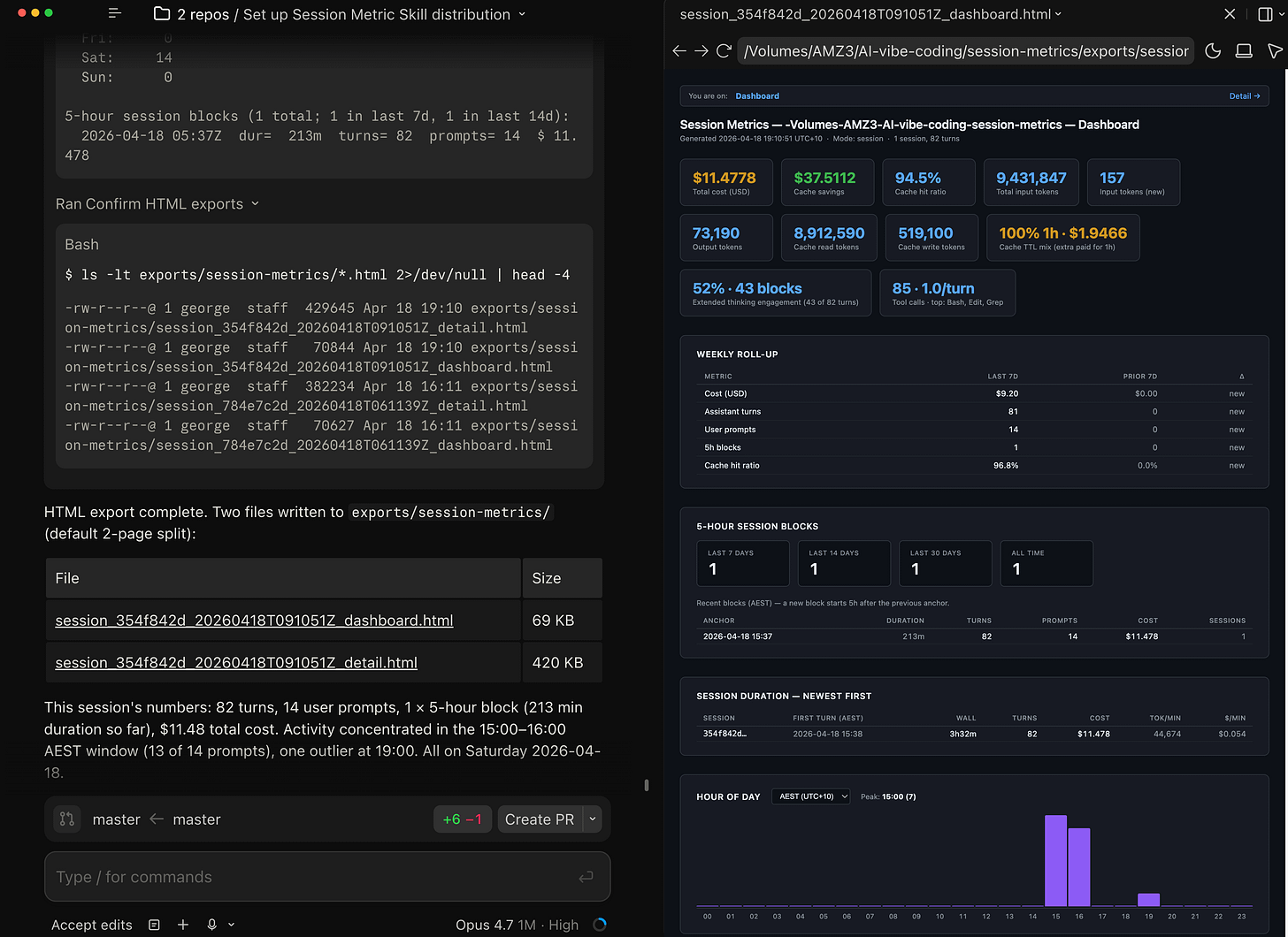 Once approved, the script runs. You will get a timeline table in stdout, four bands of stat cards, a cache-savings footer, a weekly roll-up, a 5-hour block list, and the hour-of-day punchcard. The last thing it prints is the filename it wrote, so you can open it straight away.